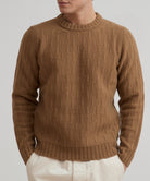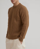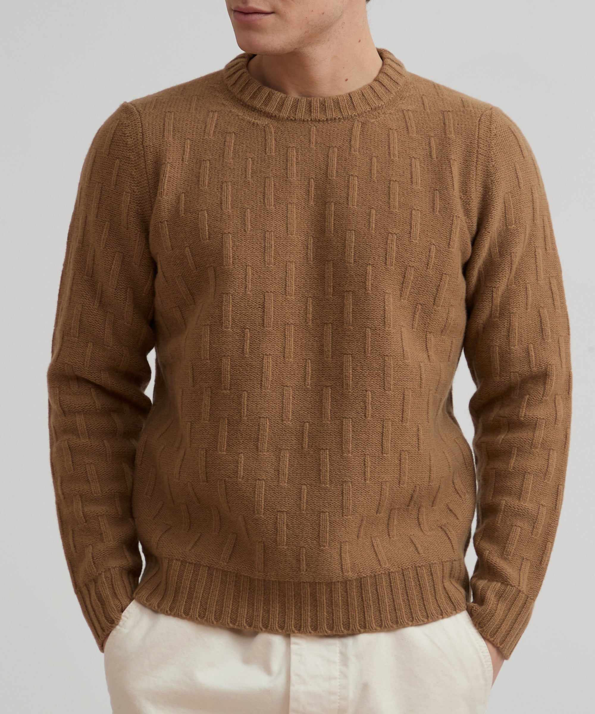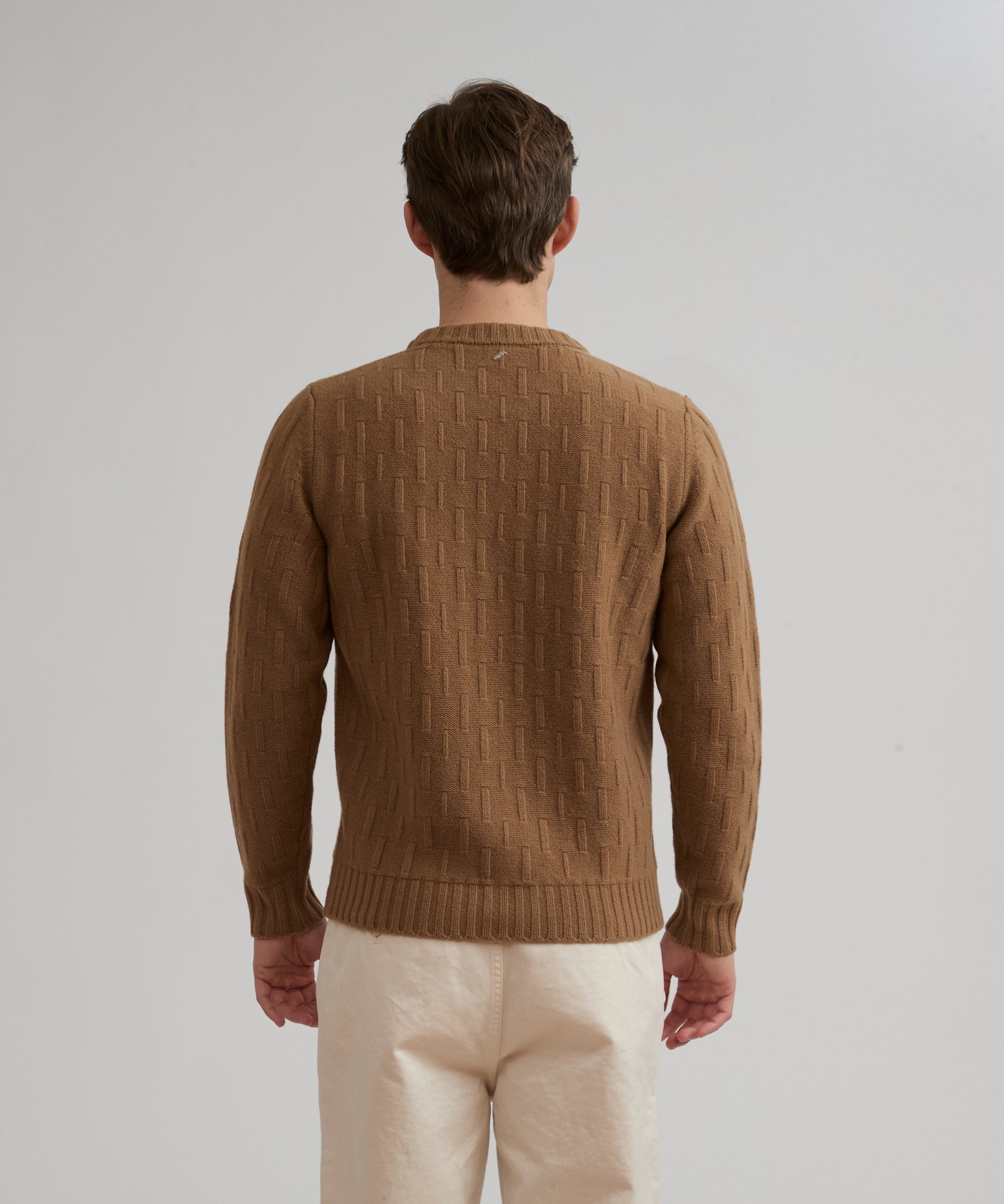 Girocollo in misto lana merino extrafine e cashmere. Modello ERYX. Disegno punto maglia basket. Collo, polsi e fondo in costina. Finezza 5.