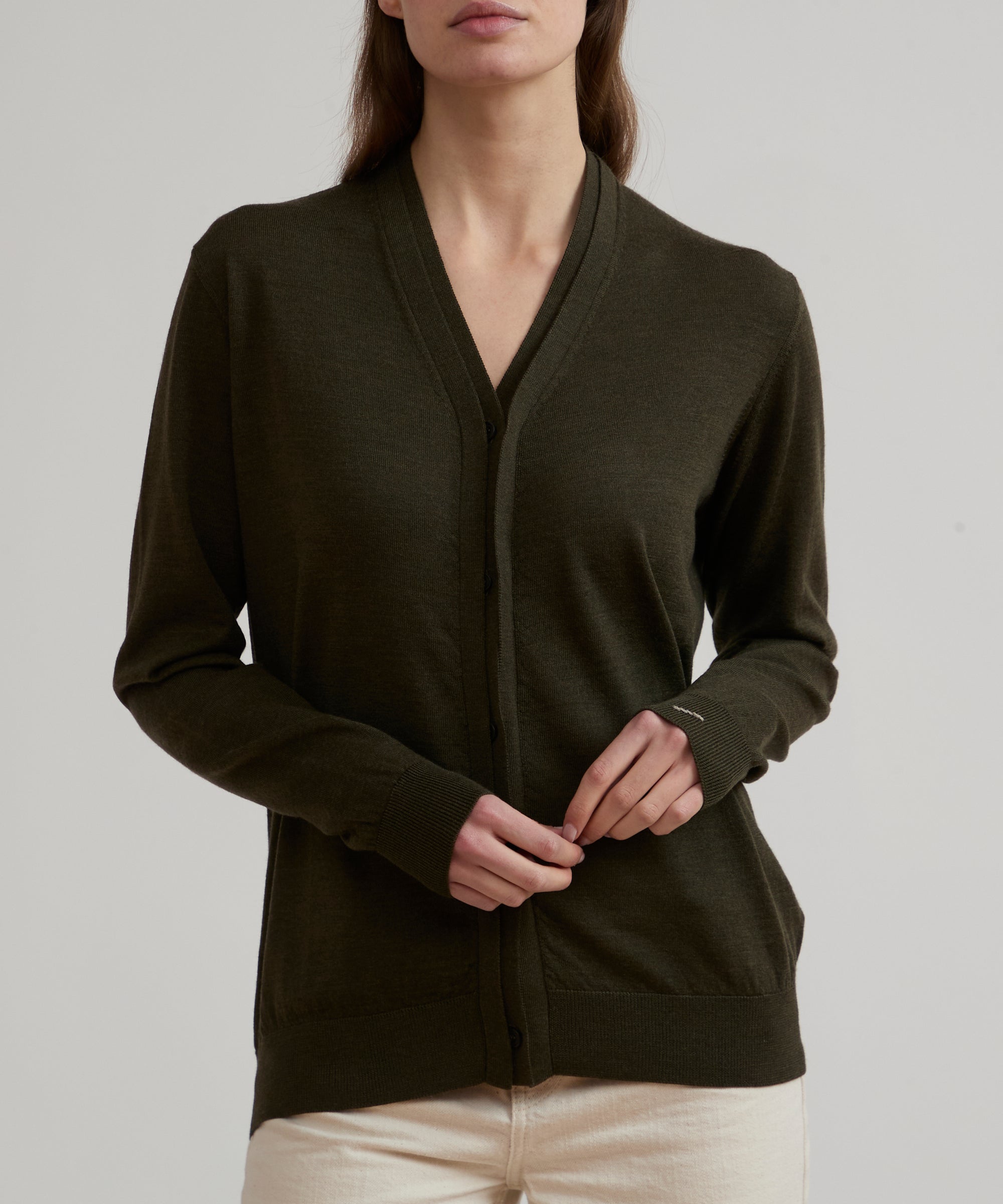 Cardigan in lana merino extrafine pettinata. Modello PATHOS. Dettaglio doppia abbottonatura sovrapposta nel centro davanti. Bottoni logati lateralmente in vero corno. Polsini e fondo in costina. Finezza 14. 4 stagioni.
