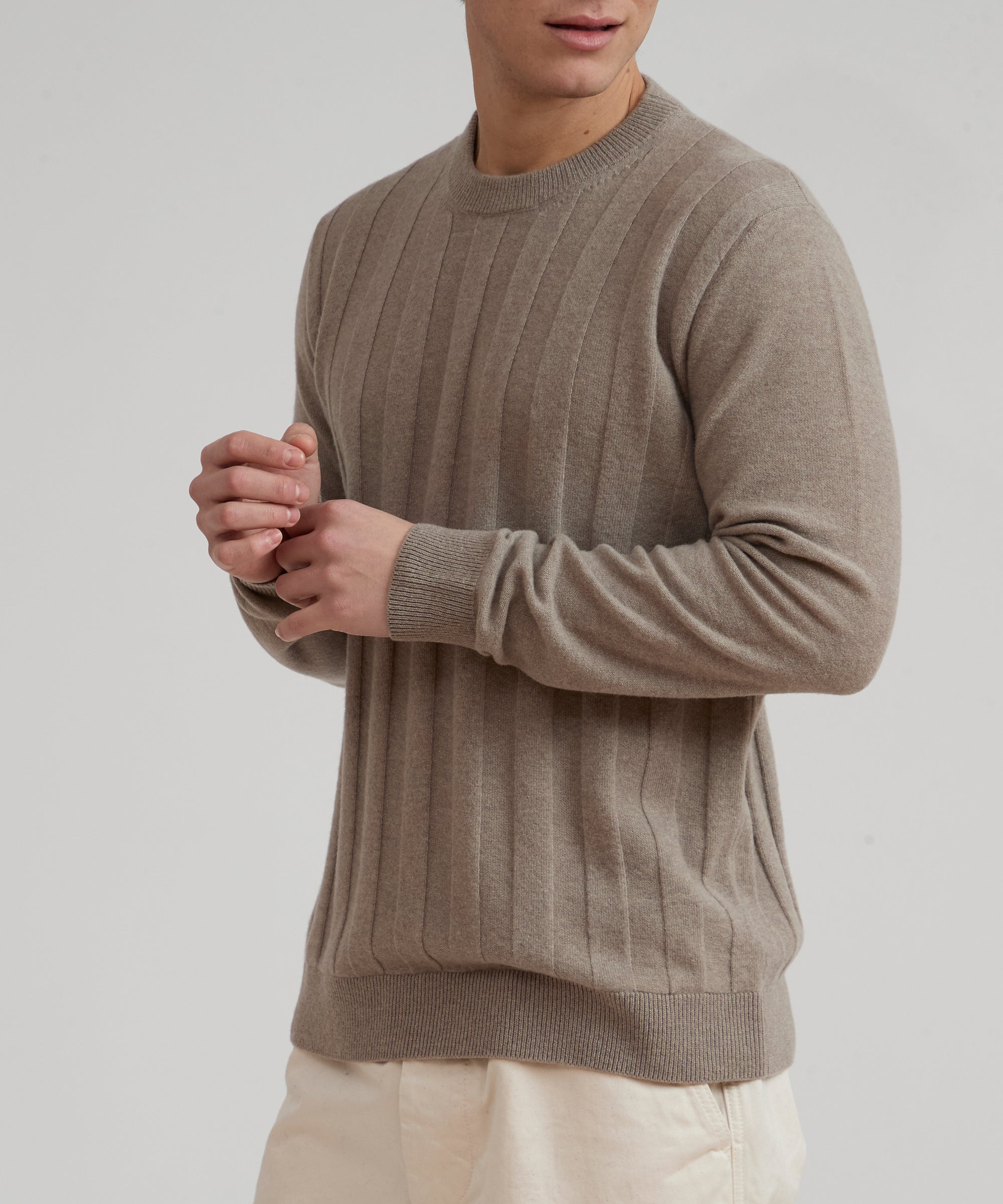 Girocollo in lana merino extrafine cardata. Modello ANDROS. Maglia soffice a disegno coste larghe. Scollo, polsi e fondo in costina. Finezza 12.