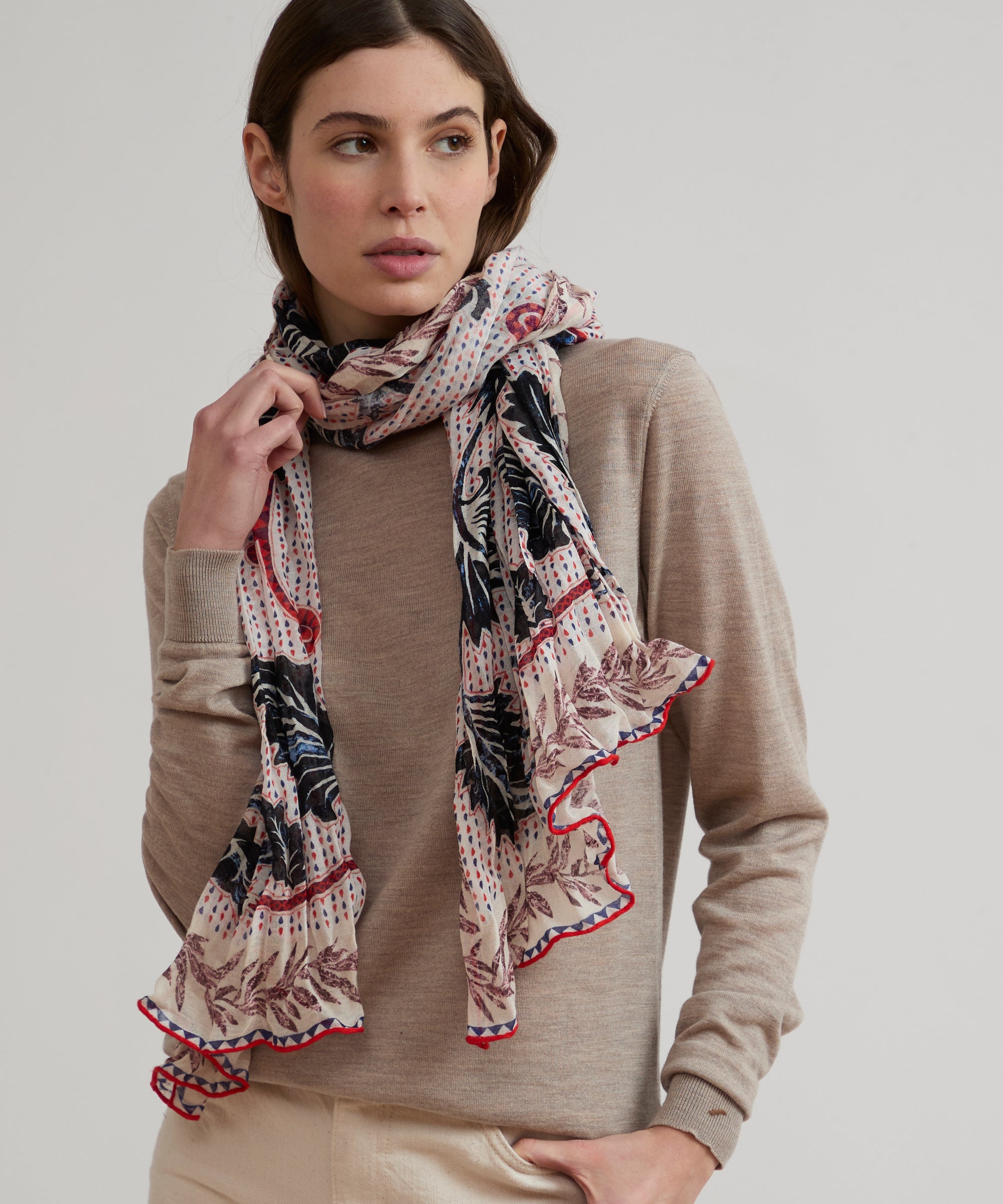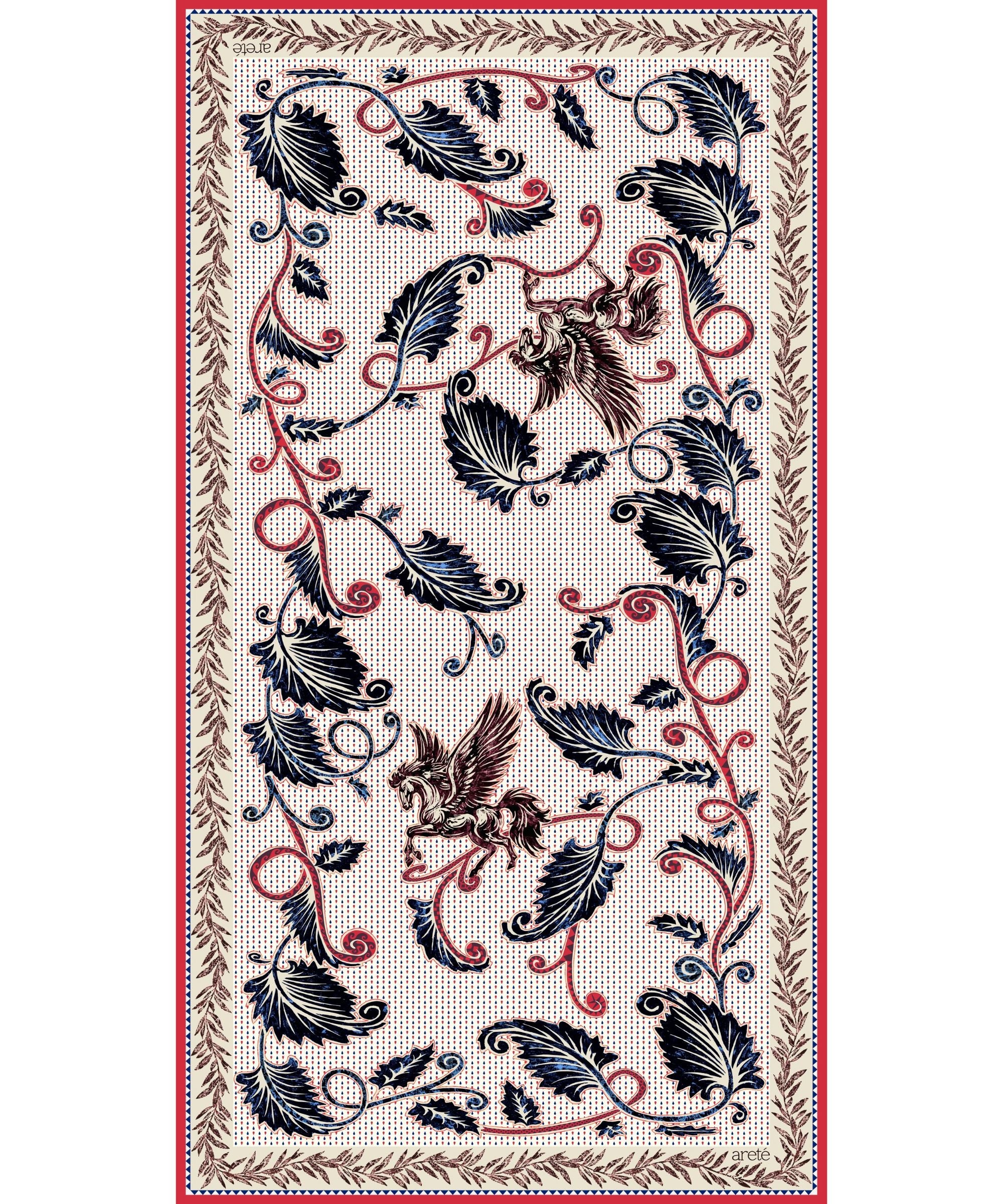 Modello PEGASO. Stola stampa stampa fantasia in misto cashmere e seta. Disegno stampa ispirata alla natura e alla Grecia. Foglie di acanto e ulivo si intrecciano al mitico Pegaso. Grazie alla sua texture morbida e destrutturata, questo elegante accessorio risulta avvolgente e versatile . Orlo in colore in contrasto rifinito a mano. Misura 180 cm x 140 cm.