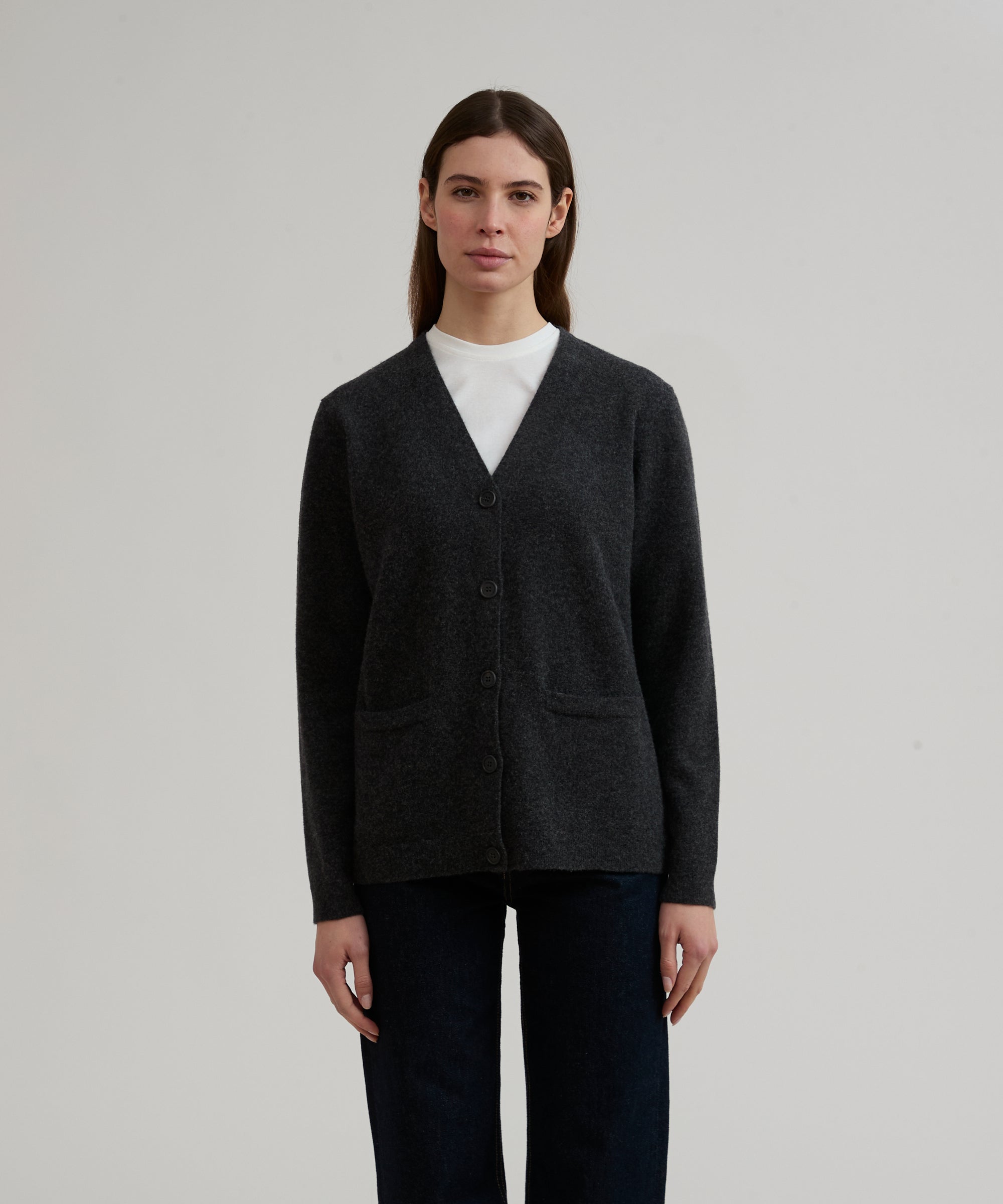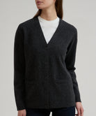 Cardigan in lana merino extrafine cardata infeltrita. Modello ELEKTRA. Realizzato in maglia soffice, presenta un’abbottonatura frontale con bottoni logati lateralmente in vero corno. Il design è completato da taschine frontali, polsi e fondo in costina. Finezza 12.