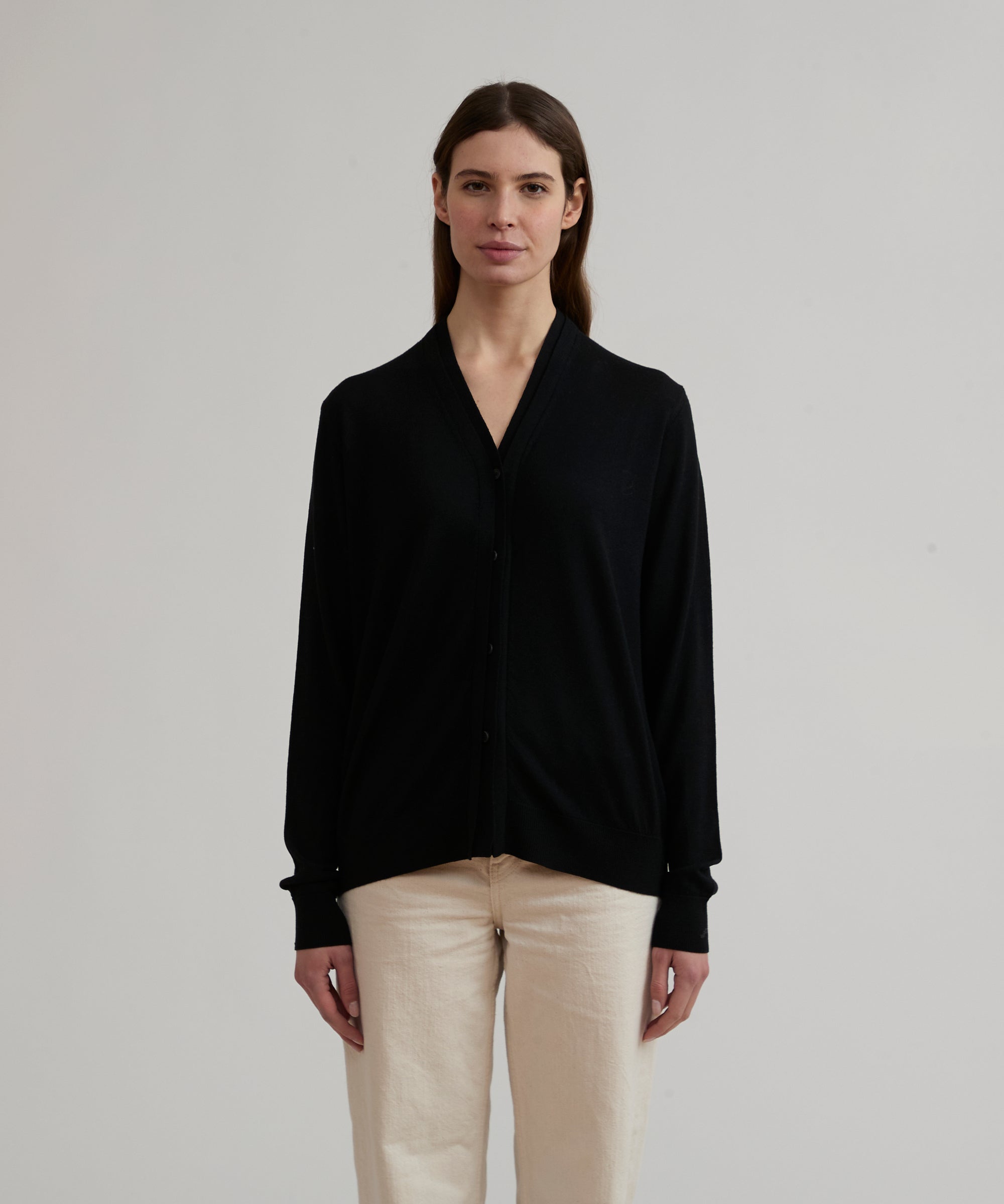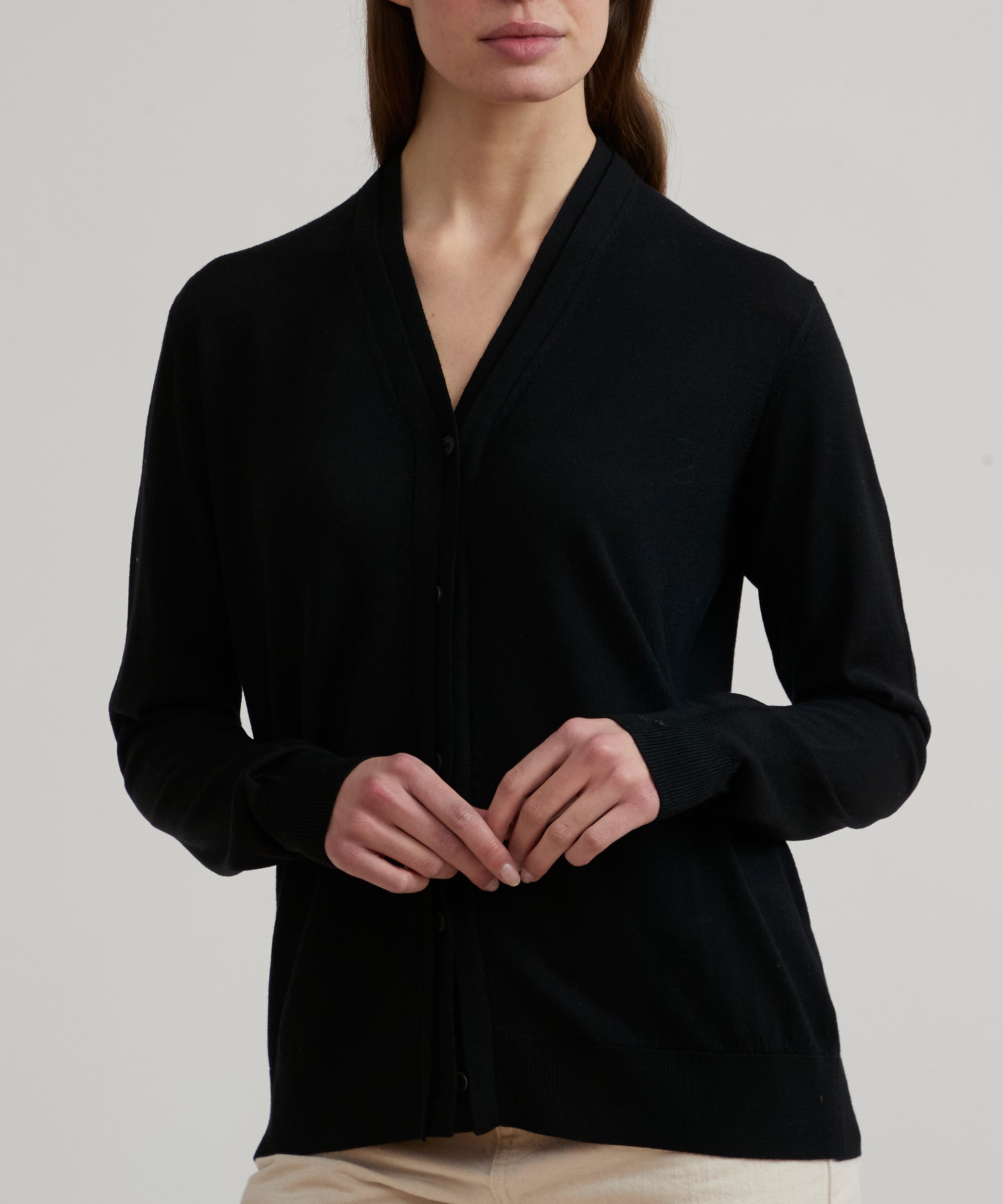 Cardigan in lana merino extrafine pettinata. Modello PATHOS. Dettaglio doppia abbottonatura sovrapposta nel centro davanti. Bottoni logati lateralmente in vero corno. Polsini e fondo in costina. Finezza 14. 4 stagioni.