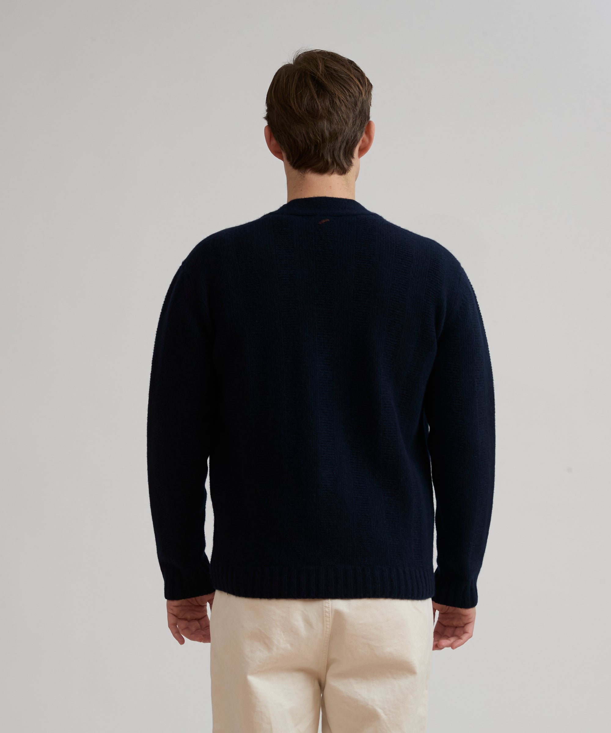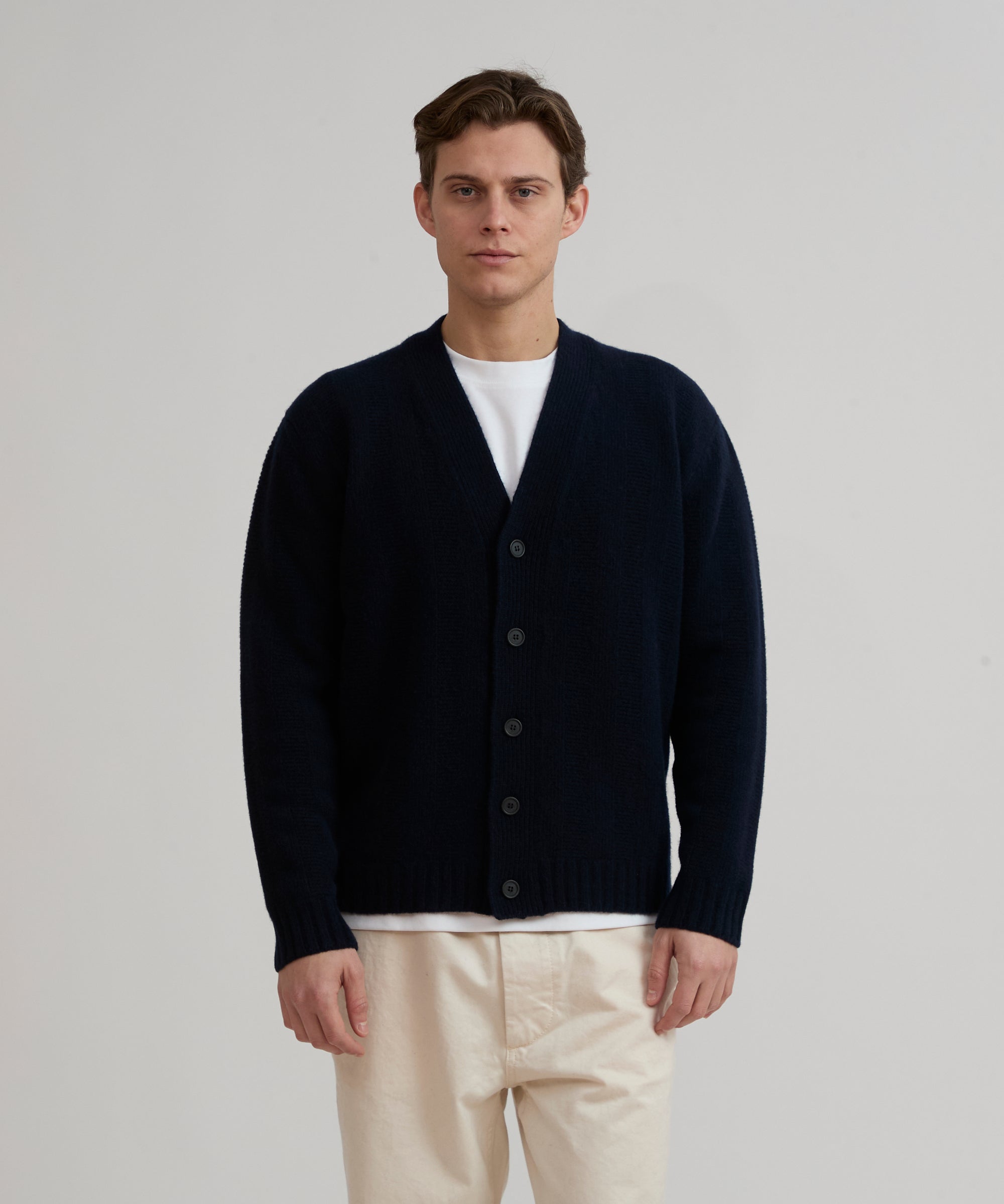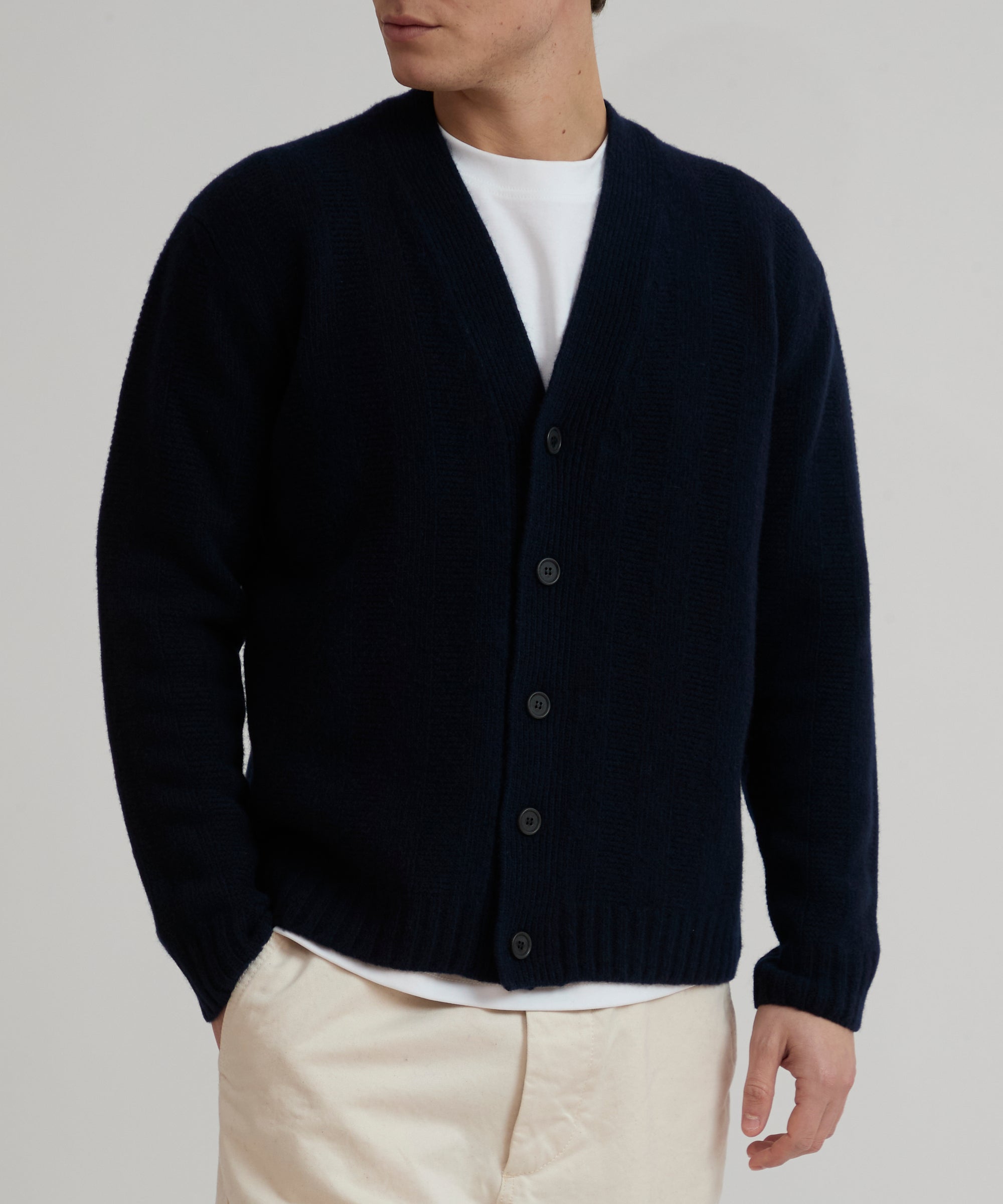 Cardigan maxi coste in lana merino extrafine cardata. Modello NYSA. Maglia soffice a disegno coste larghe alternate a links. Abbottonatura frontale con bottoni logati lateralmente in vero corno. Polsi e fondo in costina. Finezza 5.