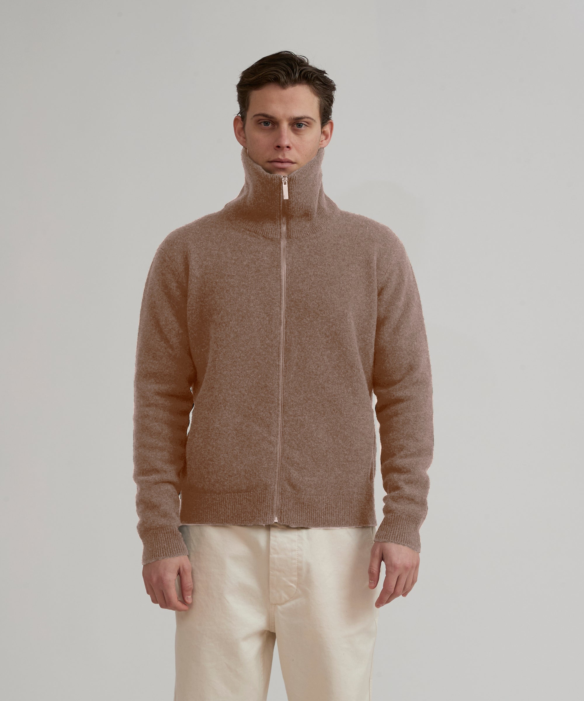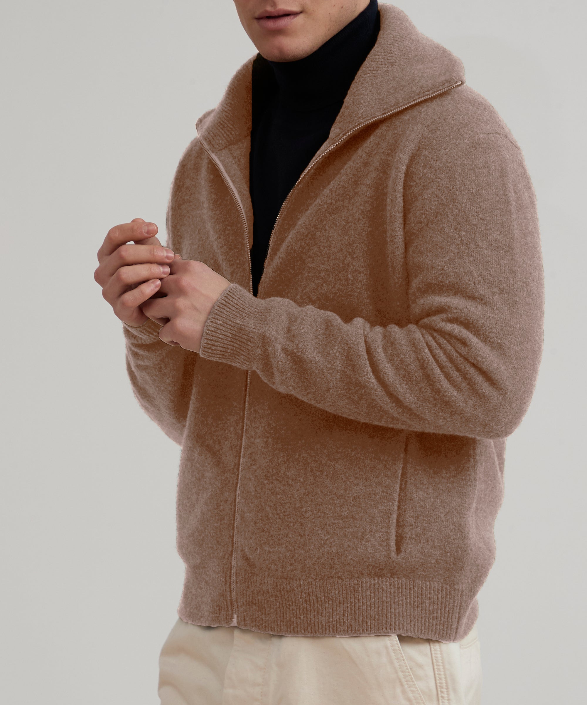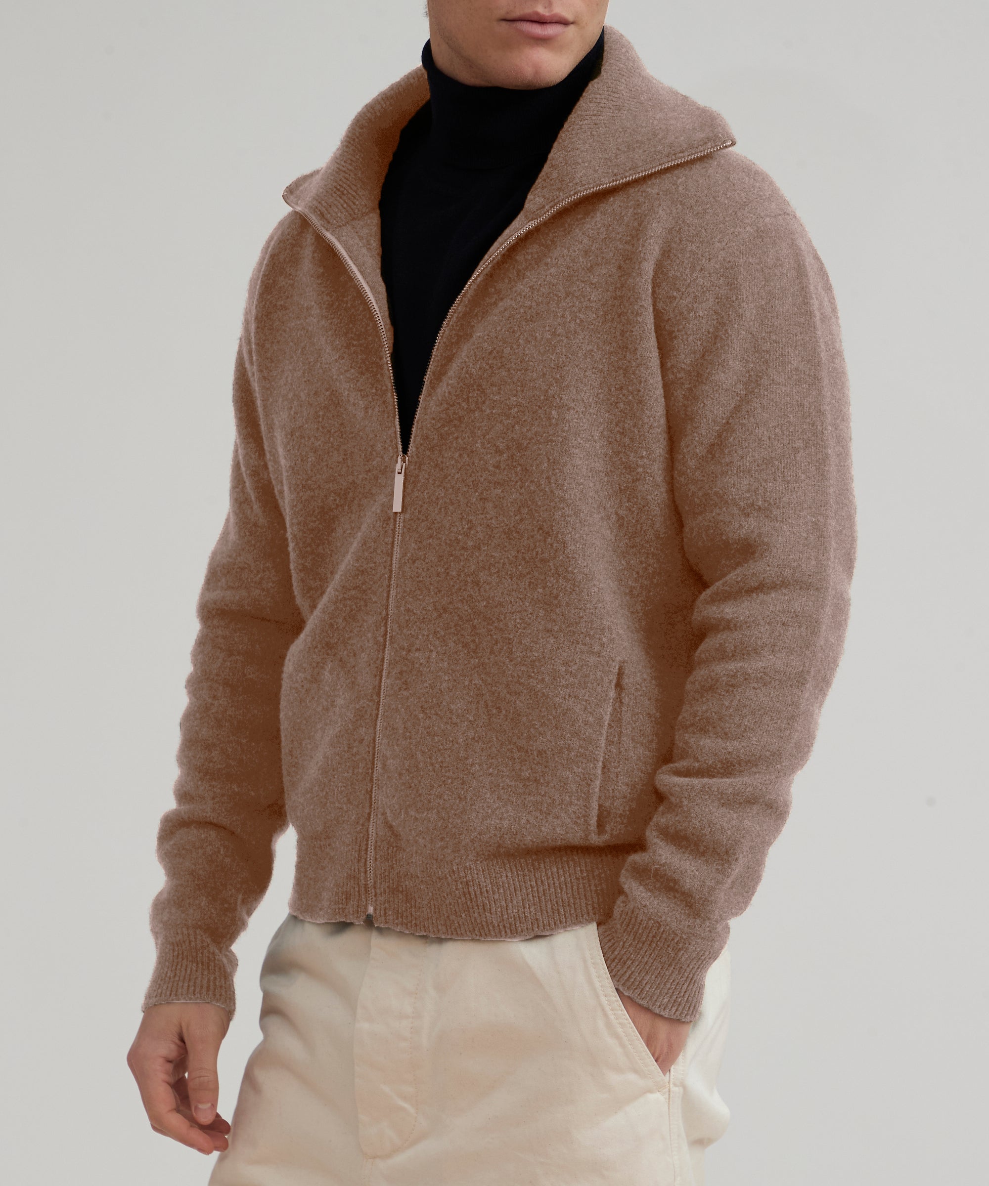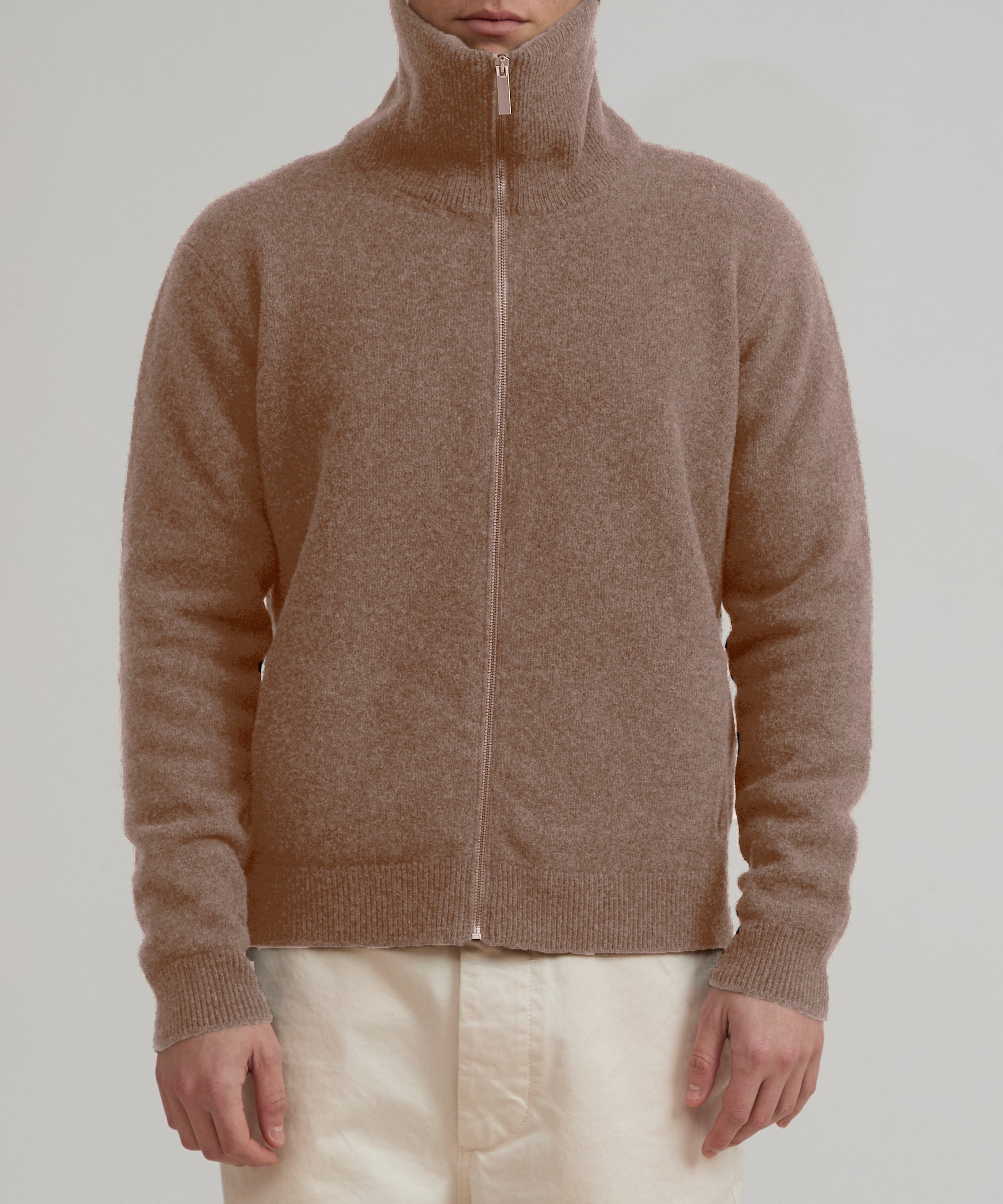 Cardigan collo alto in lana merino extrafine infeltrita. Modello ARES. Maglia soffice. Tasche a filetto laterali. Apertura frontale con zip logata canna di fucile. Finezza 7.