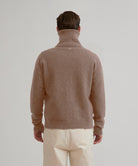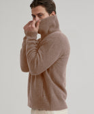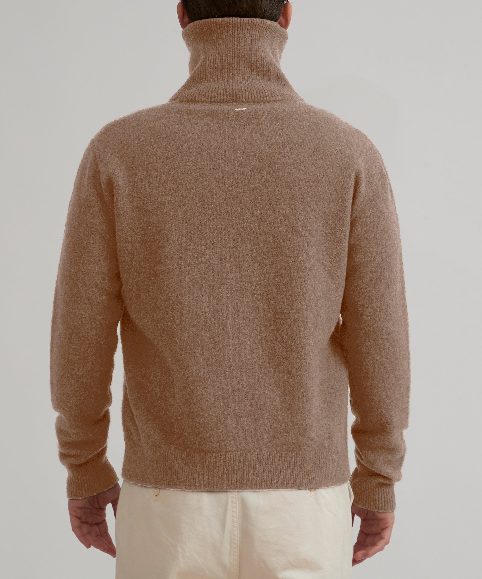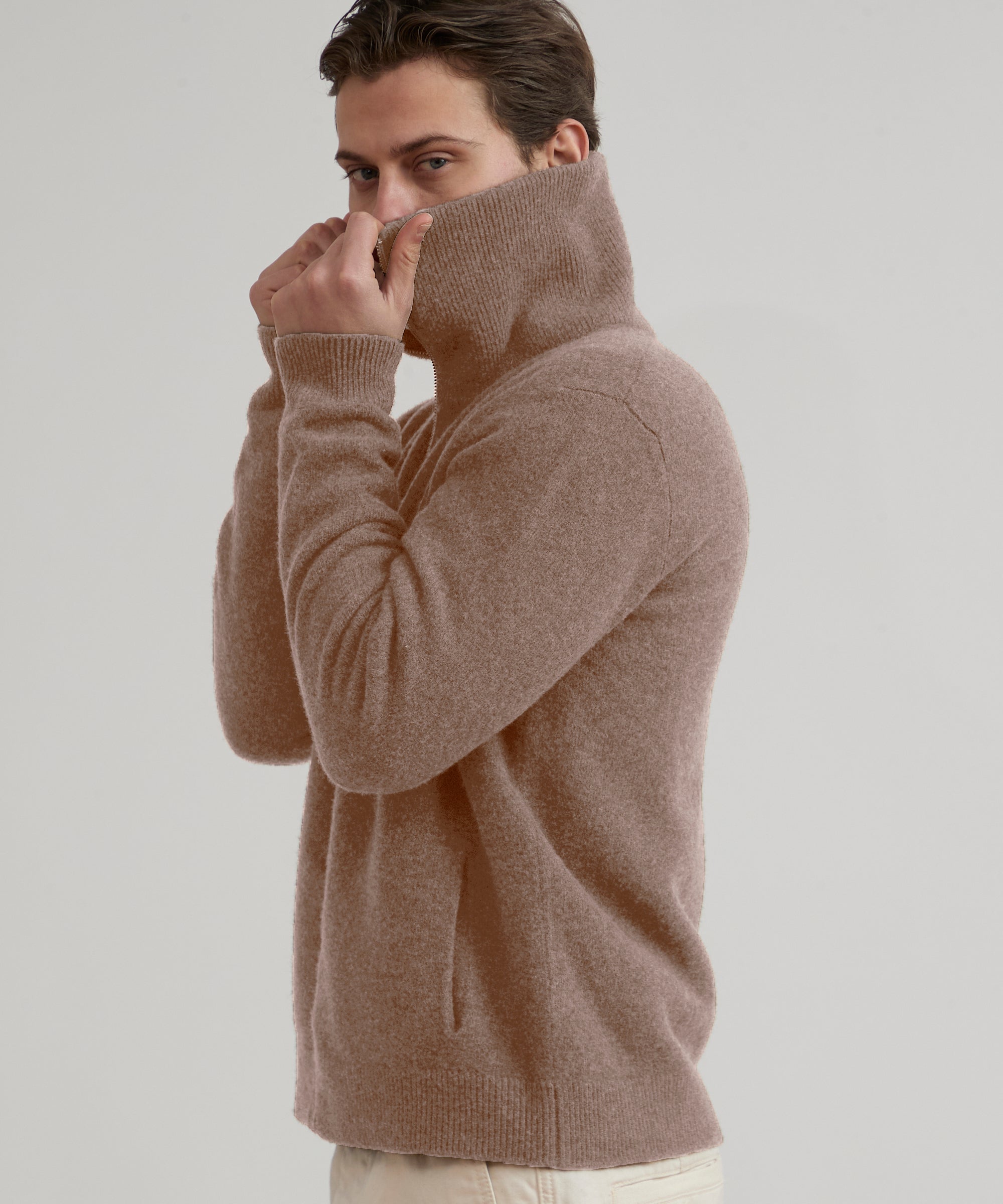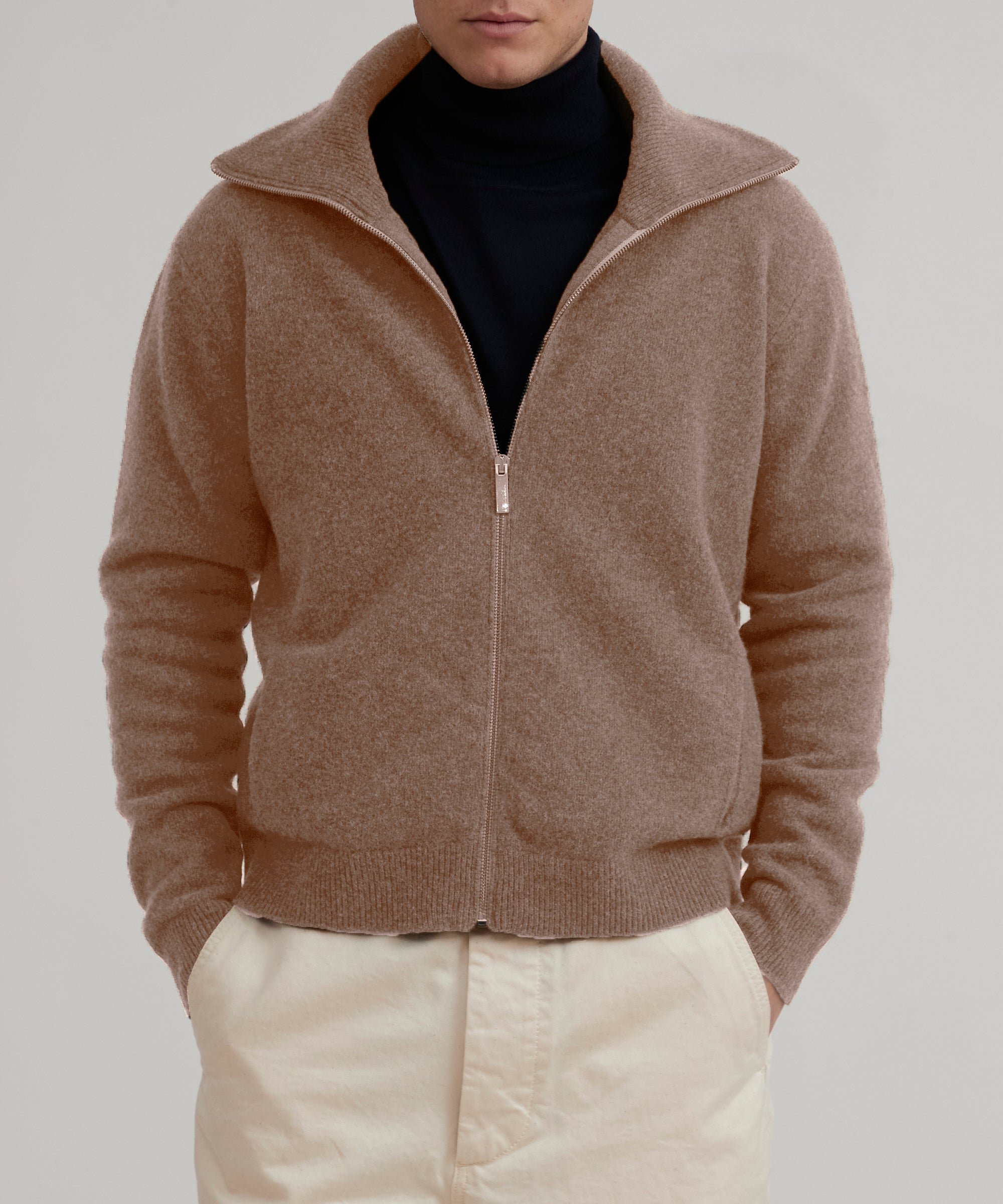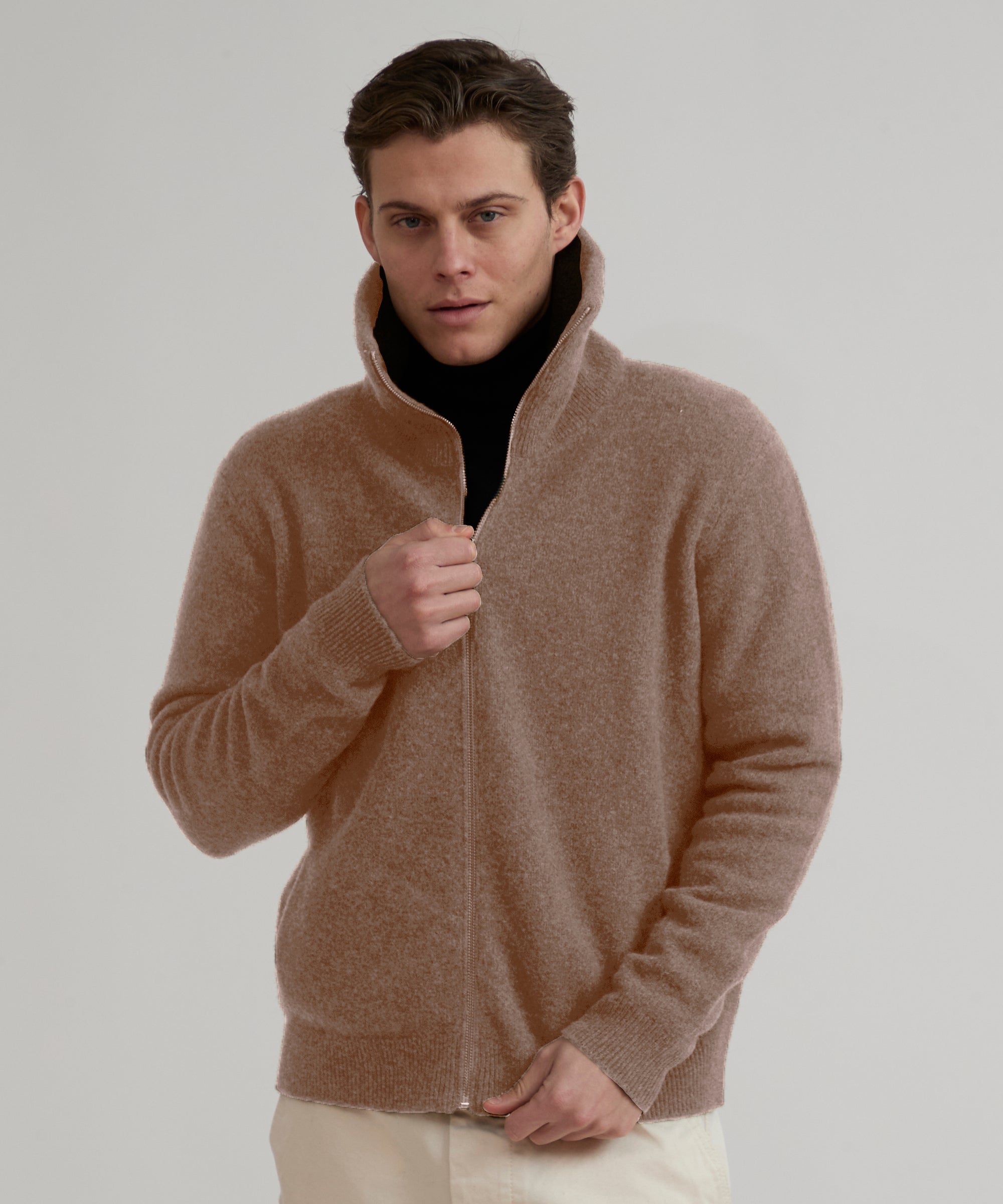 Cardigan collo alto in lana merino extrafine infeltrita. Modello ARES. Maglia soffice. Tasche a filetto laterali. Apertura frontale con zip logata canna di fucile. Finezza 7.