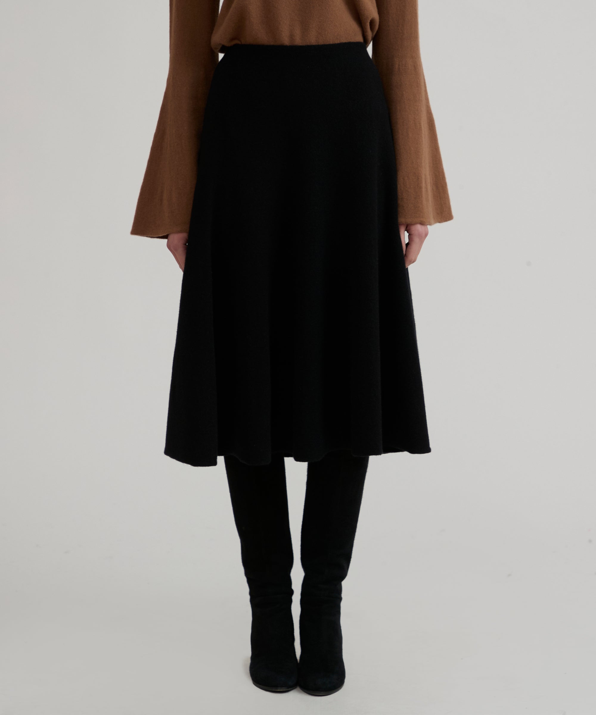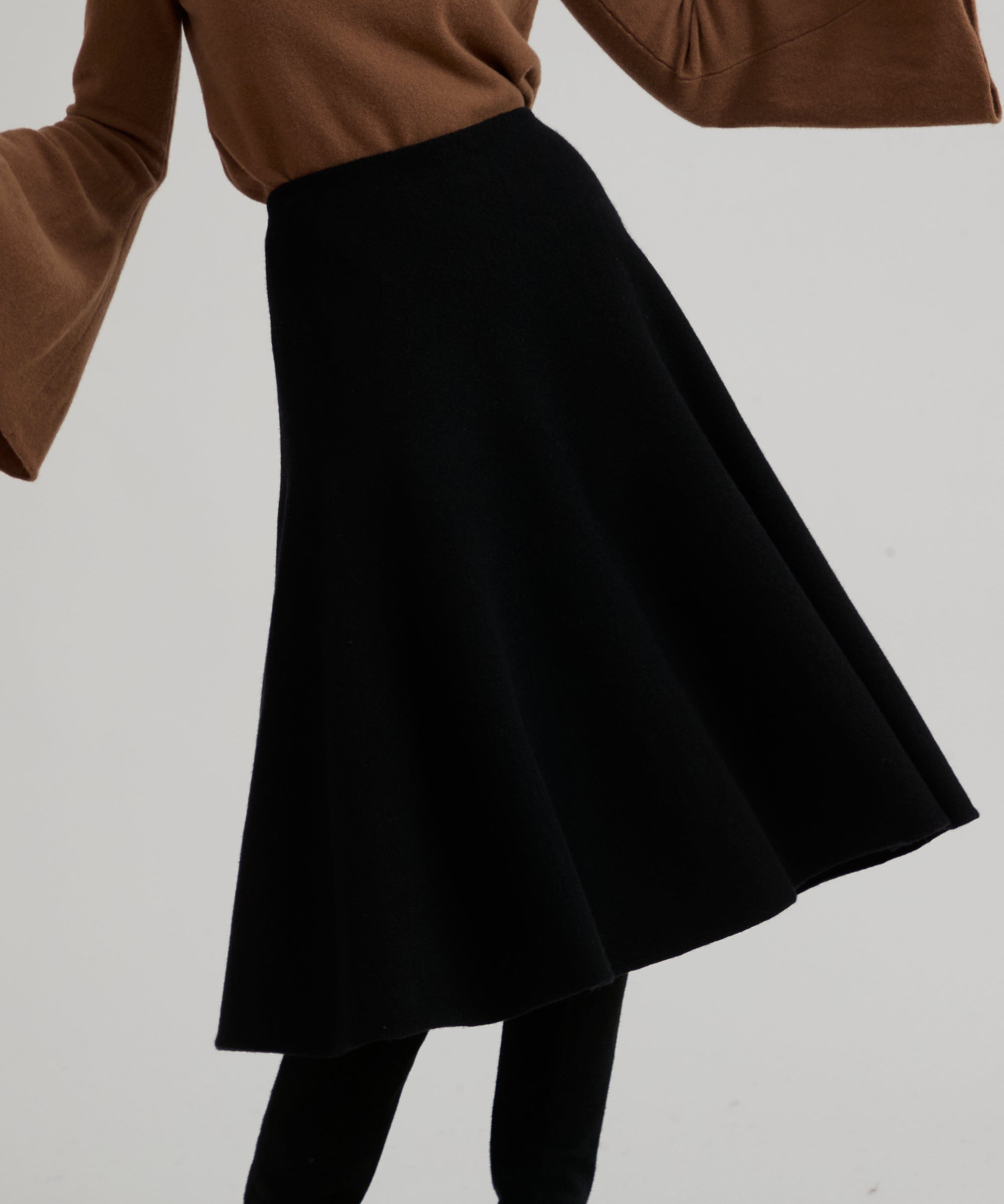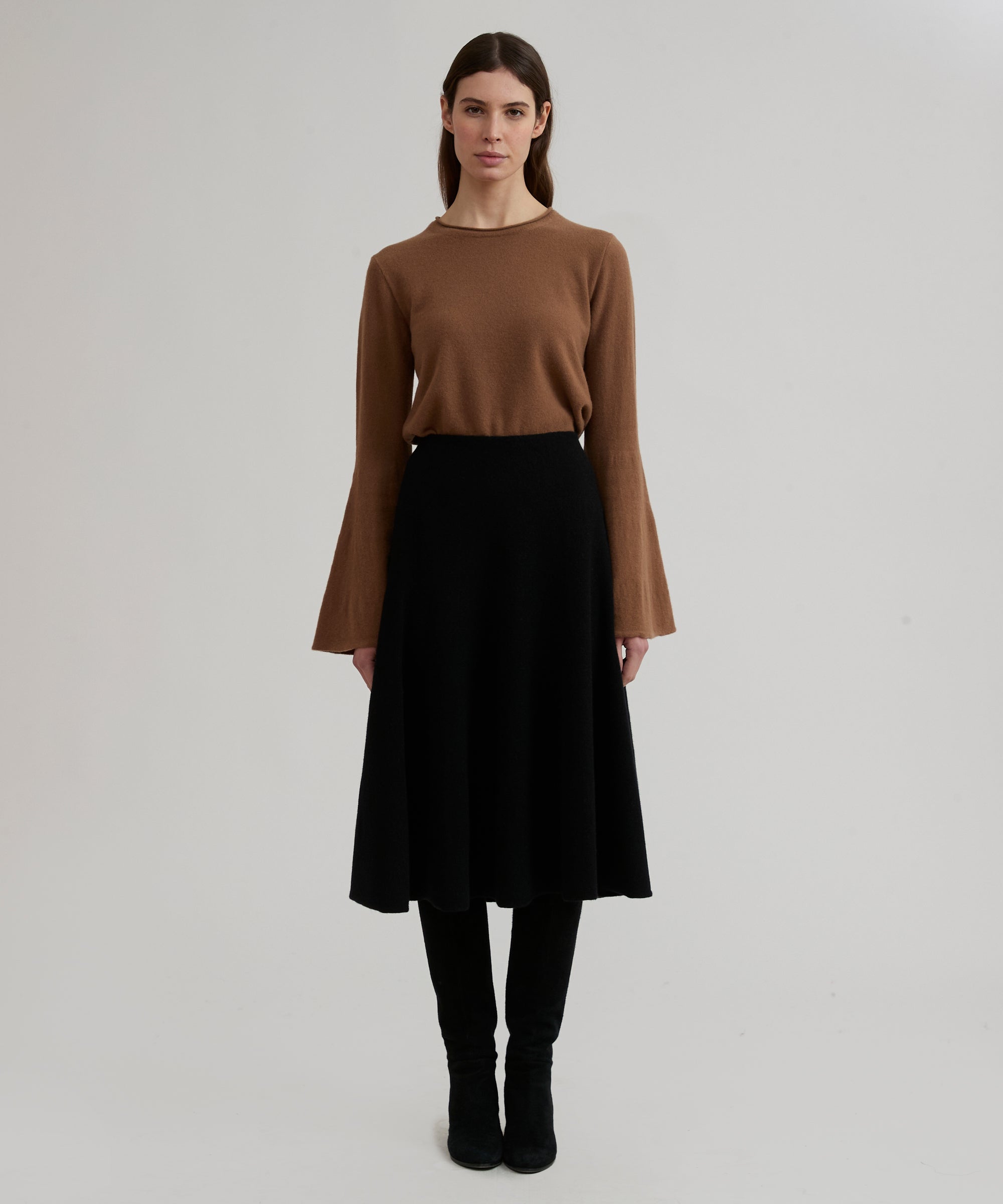 Gonna midi in lana merino extrafine cardata infeltrita. Modello ASTRA con lavorazione a finezza 12. Il fit ampio valorizza la costruzione a ruota, conferendo al capo un aspetto soffice e fluido.