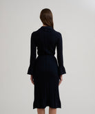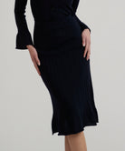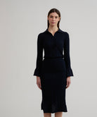 Gonna midi costine irregolari in lana merino extrafine pettinata. Il modello CHLORIS presenta una silhouette aderente, rifinita da un volant al fondo che dona movimento al capo. Una proposta realizzata con attenzione ai dettagli artigianali. Finezza 14.