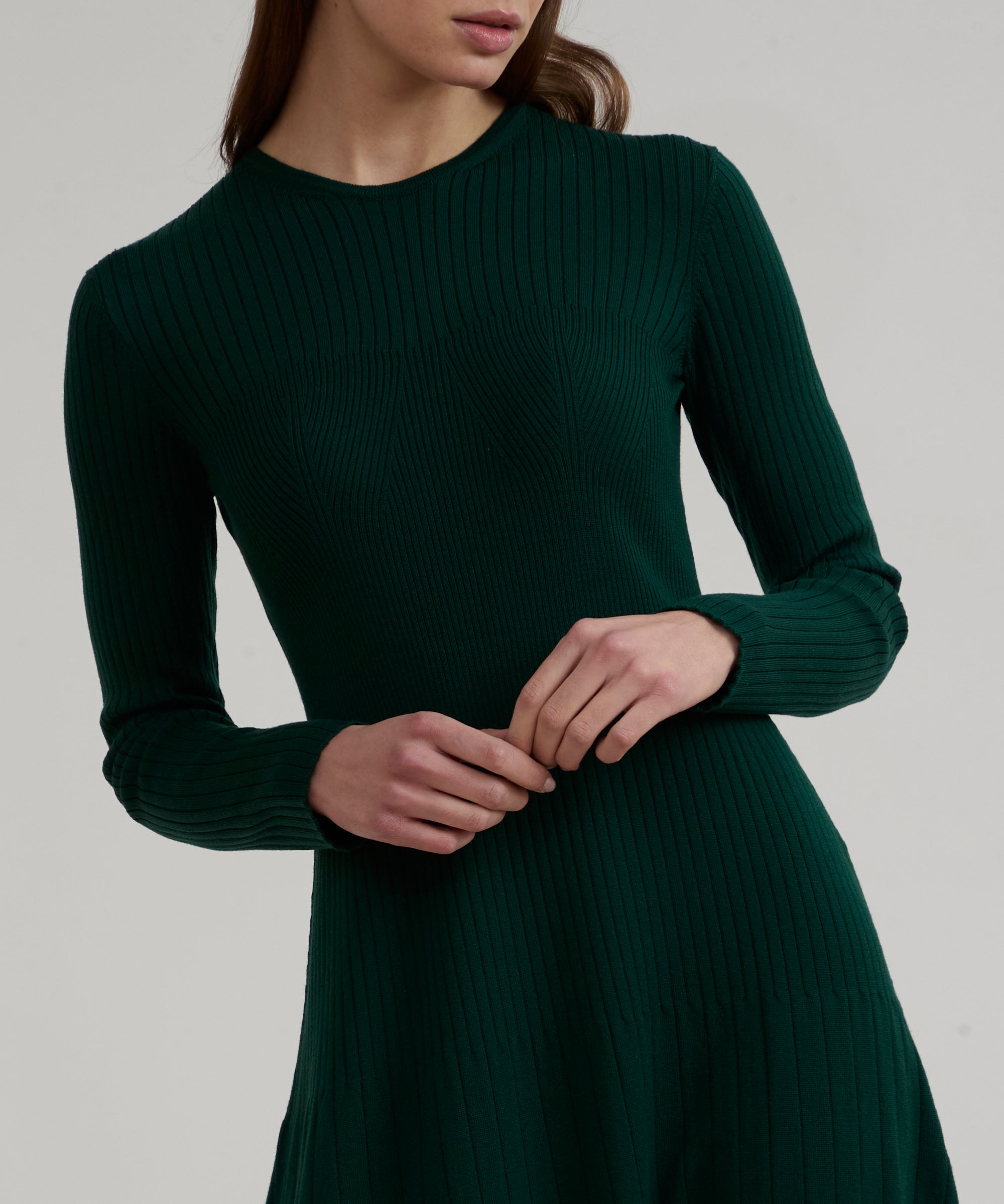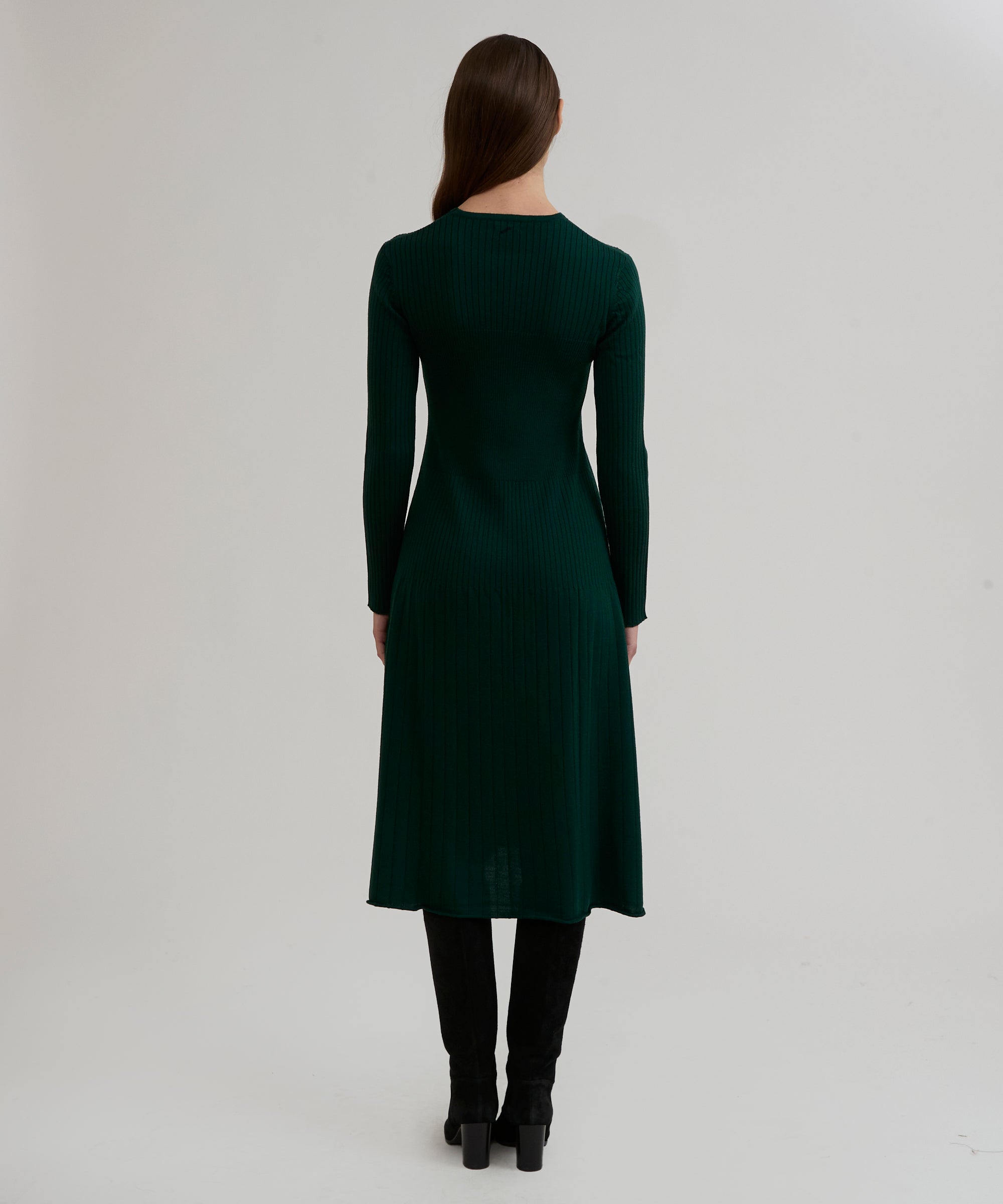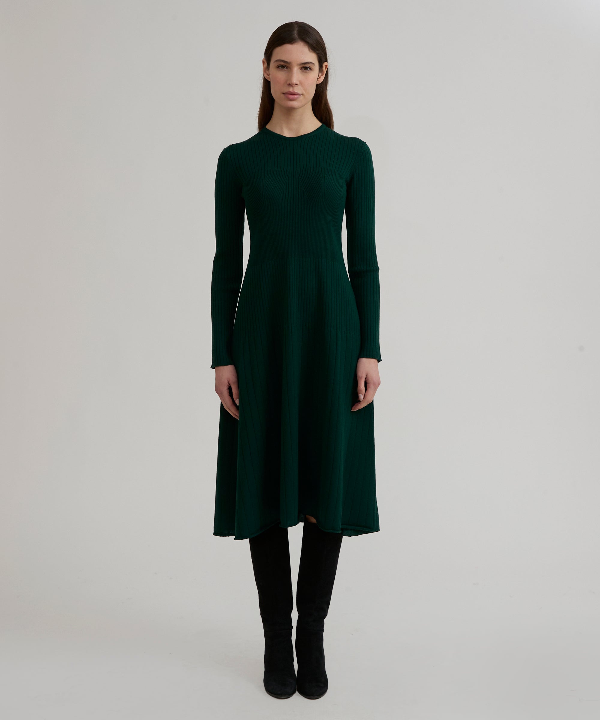 Abito lungo in lana merino extrafine pettinata. Modello SOPHIA. Disegno costine e bustino trompe l'oeil sagomato. Girocollo. Maniche lunghe. Ampia gonna linea ad A. Finezza 12.