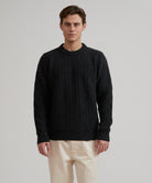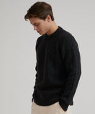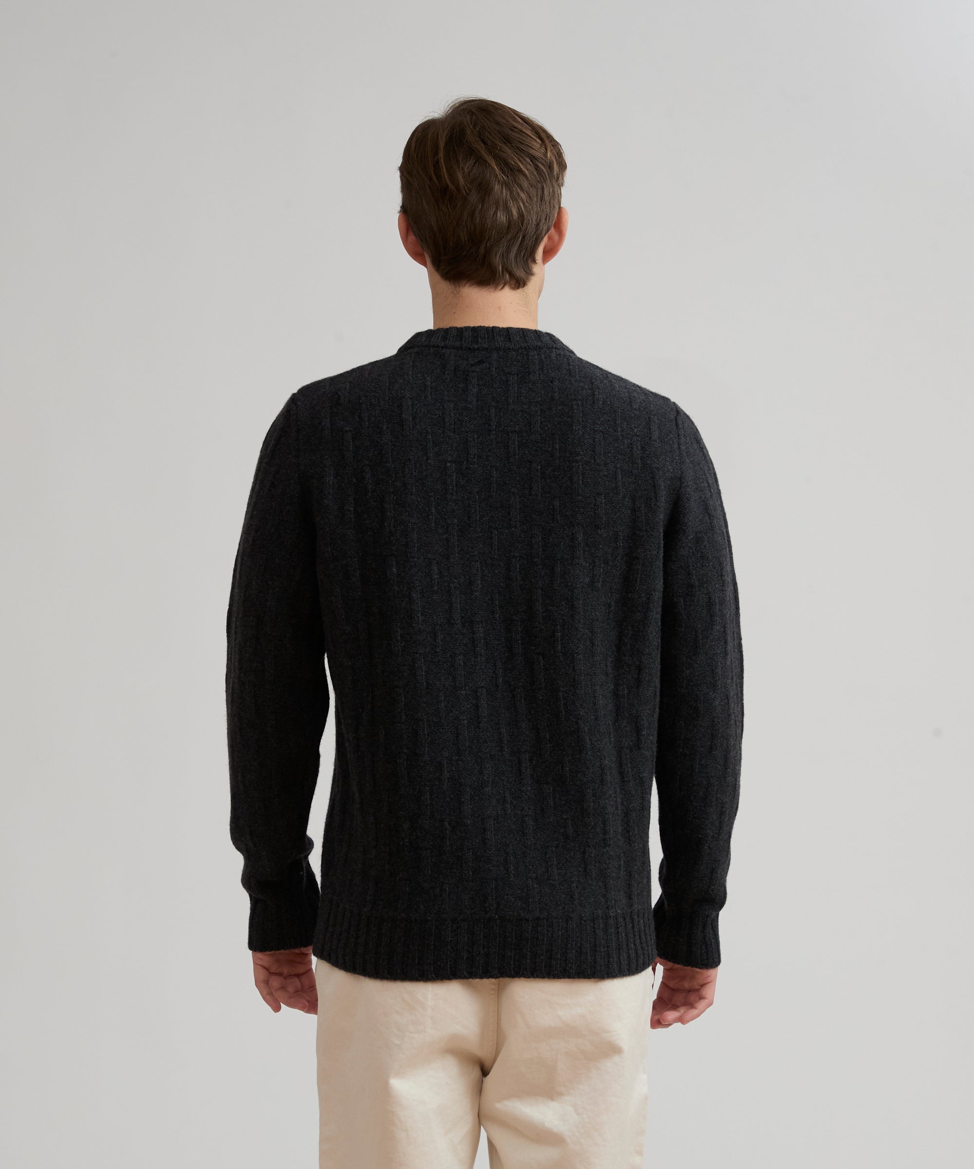 Girocollo in misto lana merino extrafine e cashmere. Modello ERYX. Disegno punto maglia basket. Collo, polsi e fondo in costina. Finezza 5.