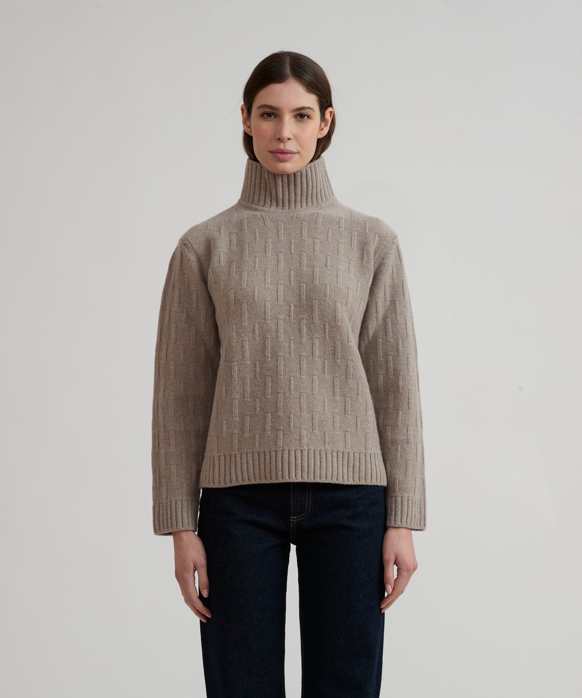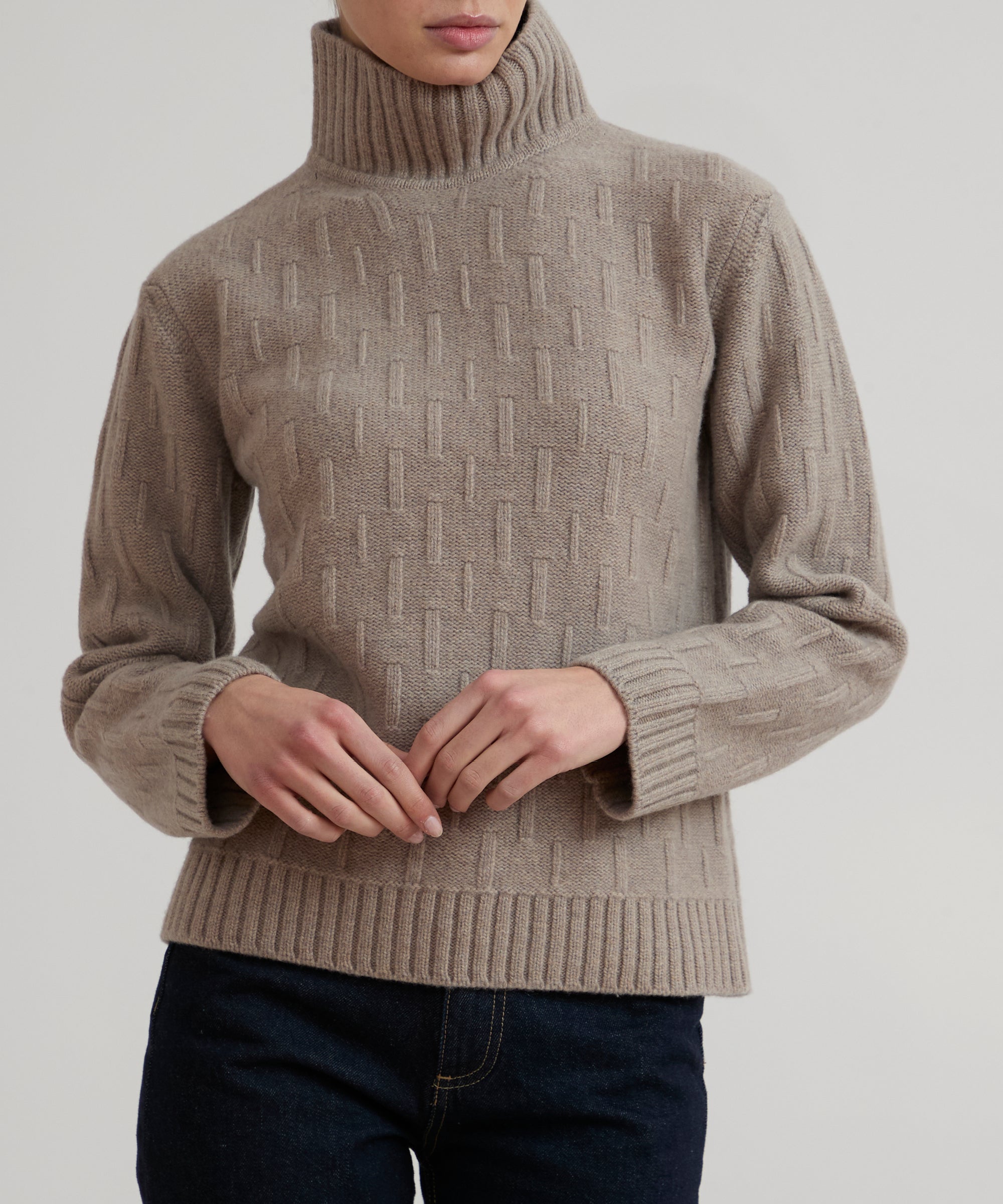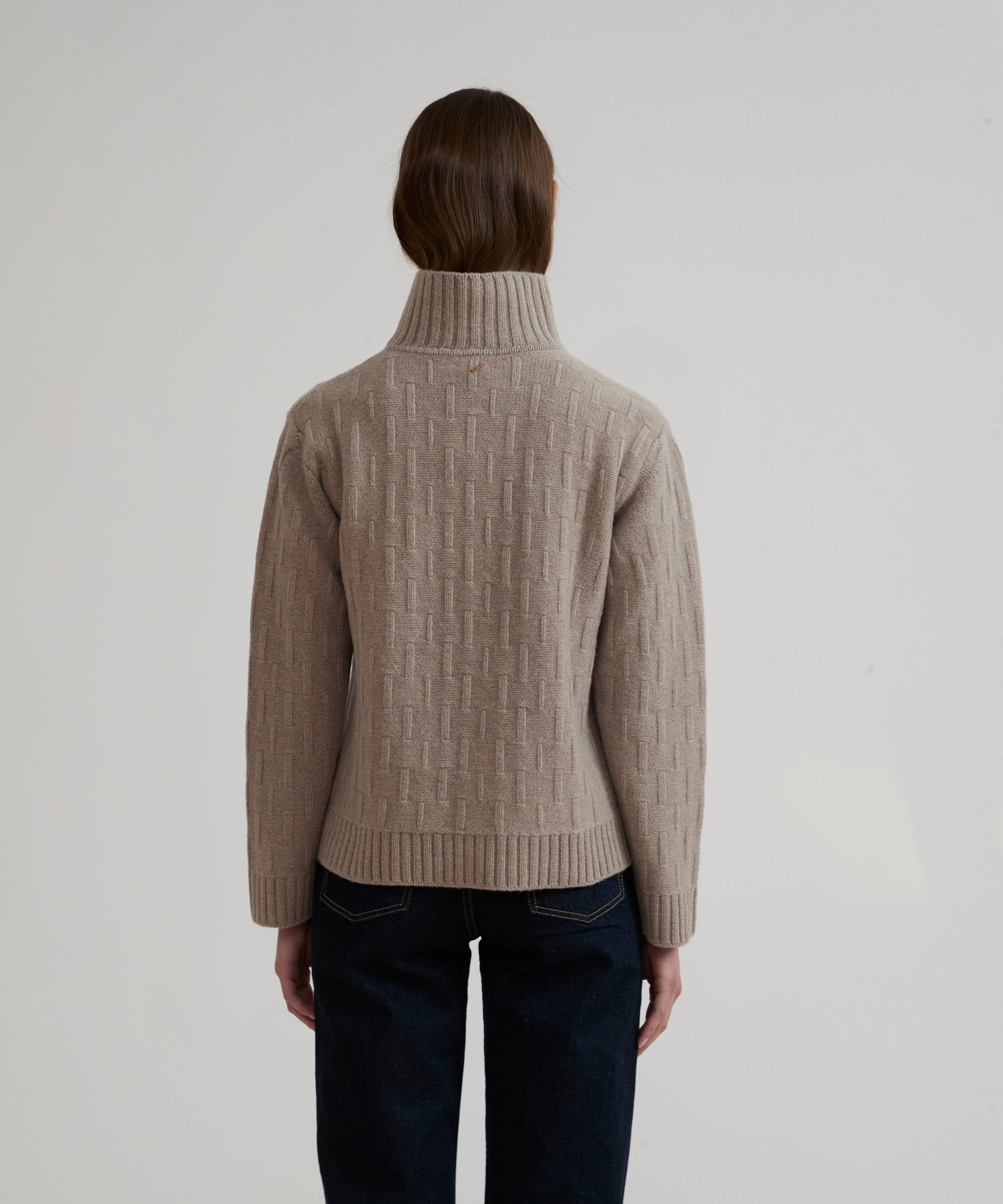 Dolce vita in misto lana merino extrafine e cashmere. Modello GAIA. Lavorazione a punto maglia basket, con collo, polsi e fondo in costina. Finezza 5.
