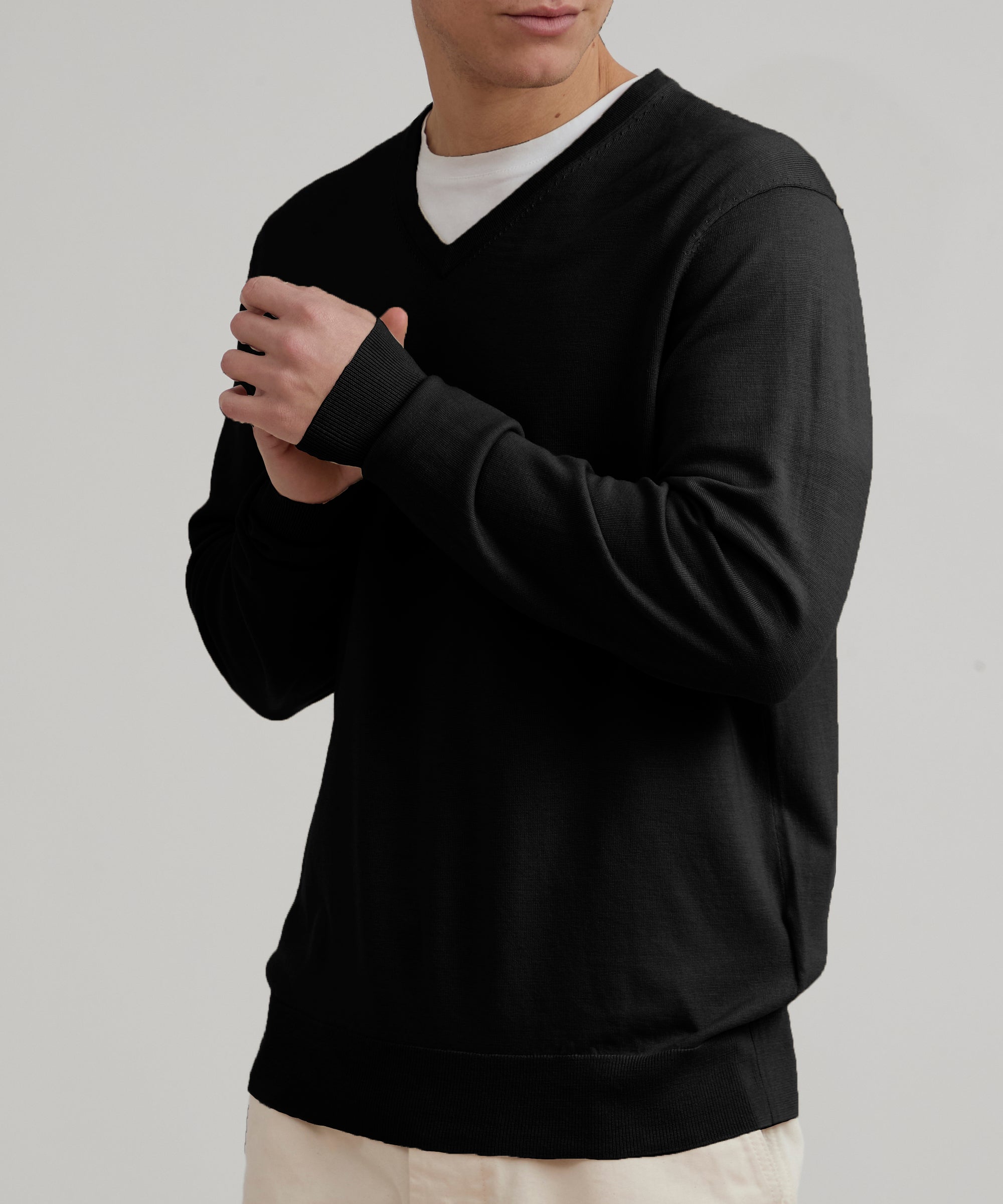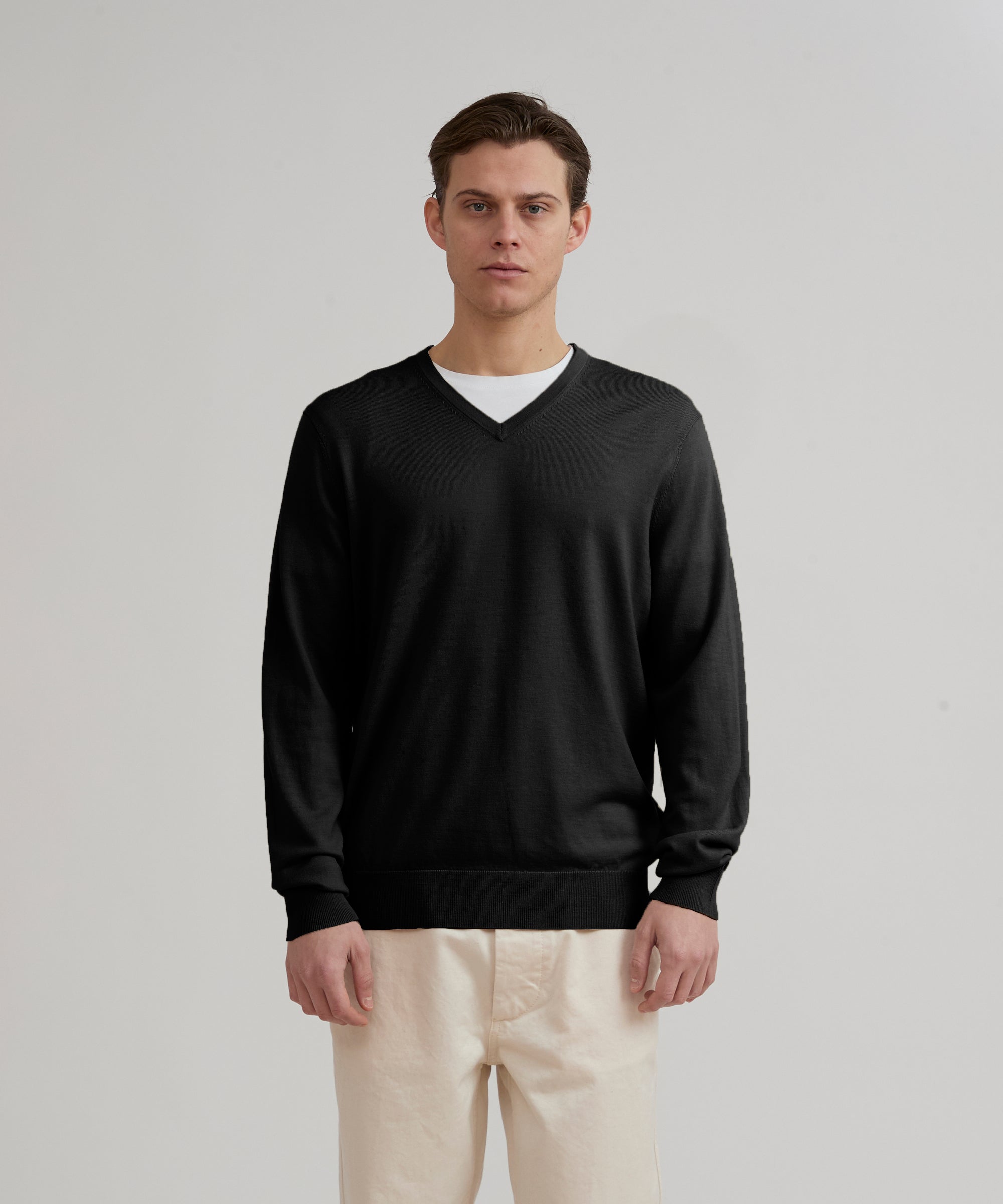 Maglia v-neck in lana merino extrafine pettinata. Modello NOUS dal fit rilassato, rifinito con scollo, polsi e fondo in costina. Finezza 14. 4 stagioni.