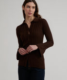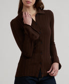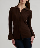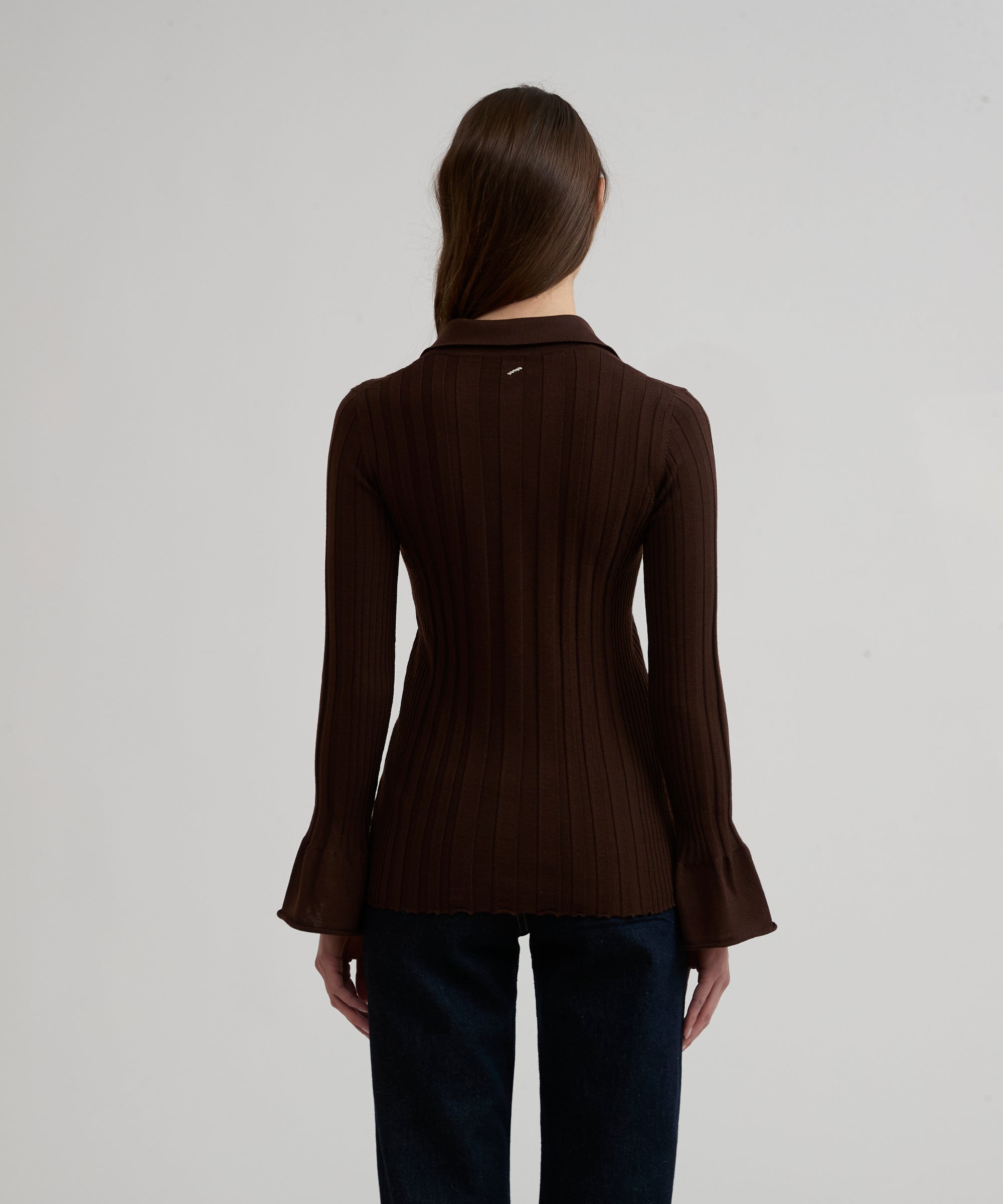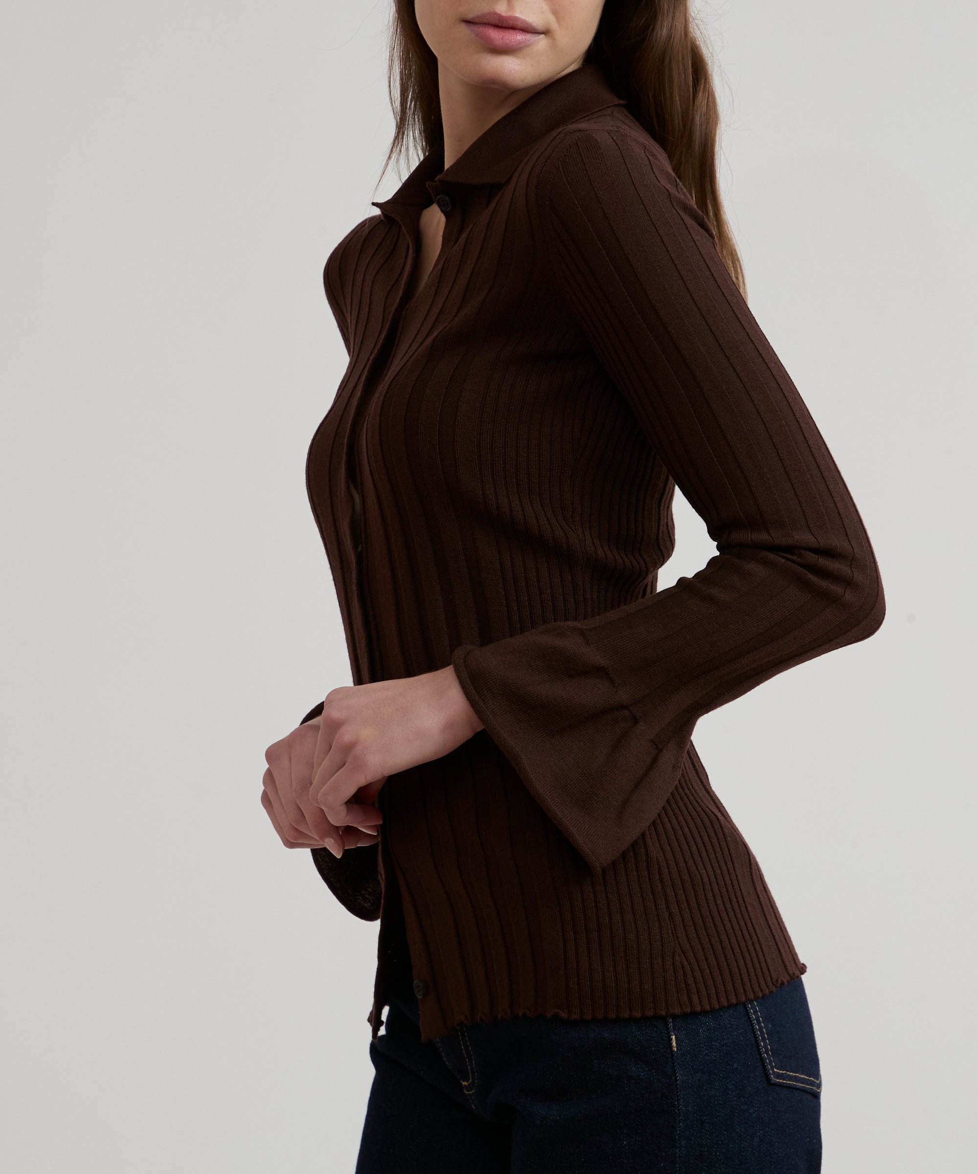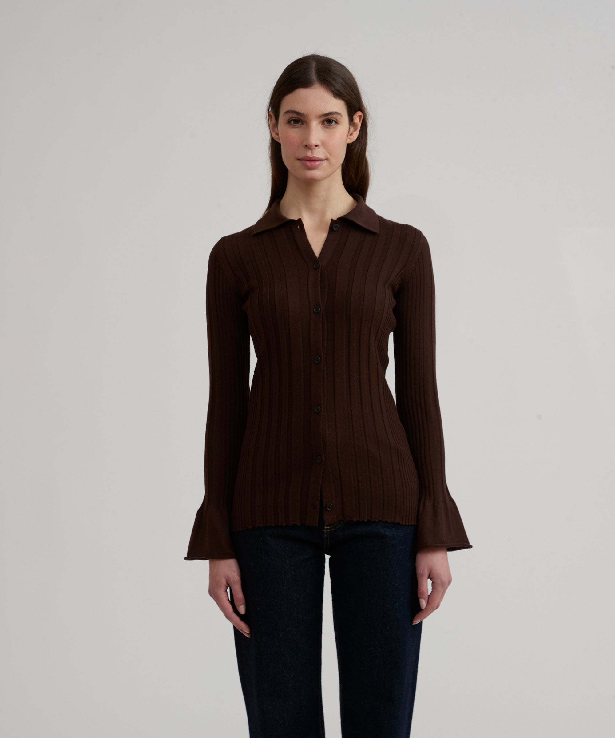 Camicia costine irregolari in lana merino extrafine pettinata. Modello EUPHEMIA. Disegno a costine irregolari. Maniche lunghe con fondo volant. Bottoni logati lateralmente in vero corno. Finezza 14.