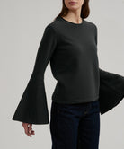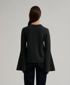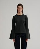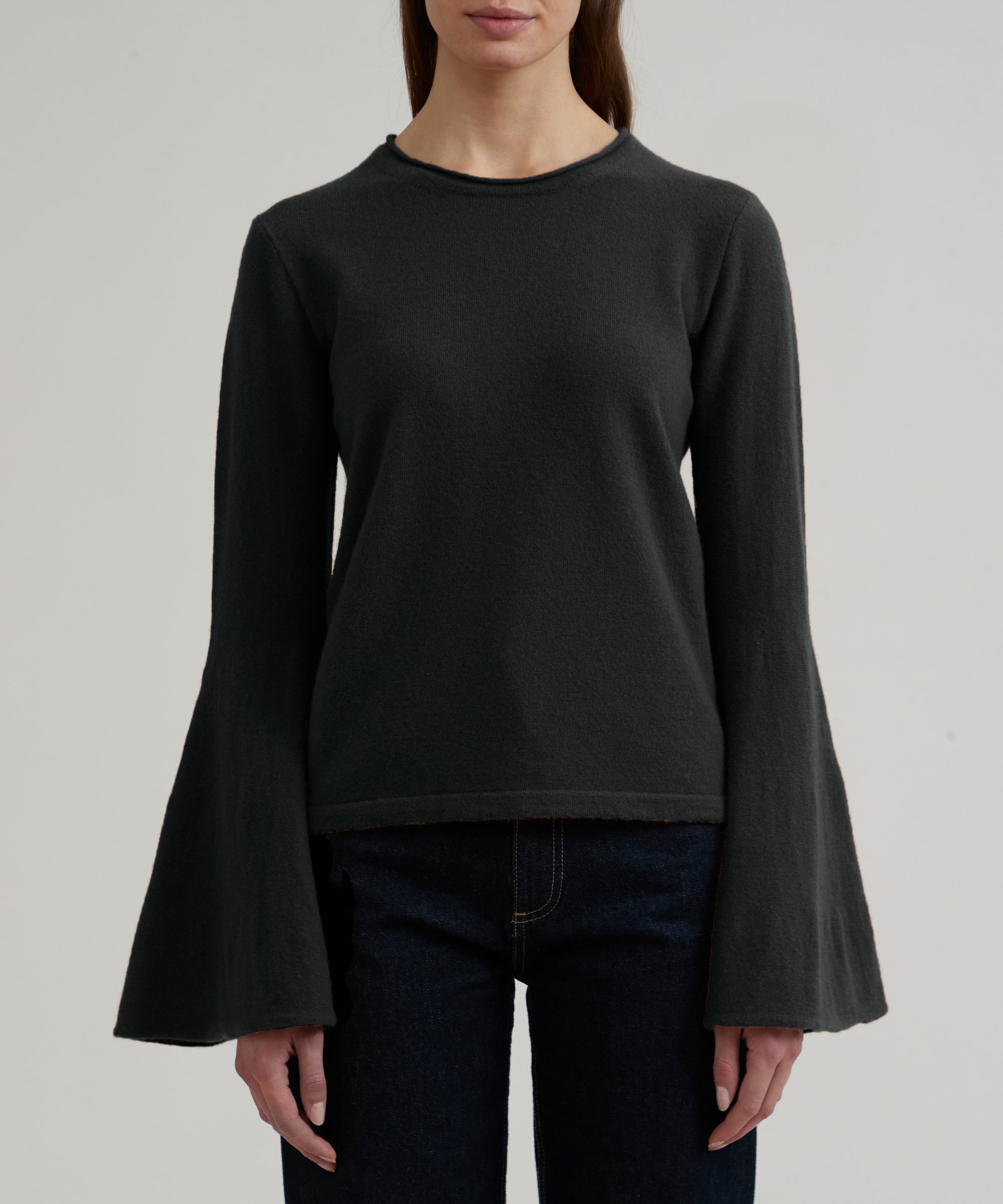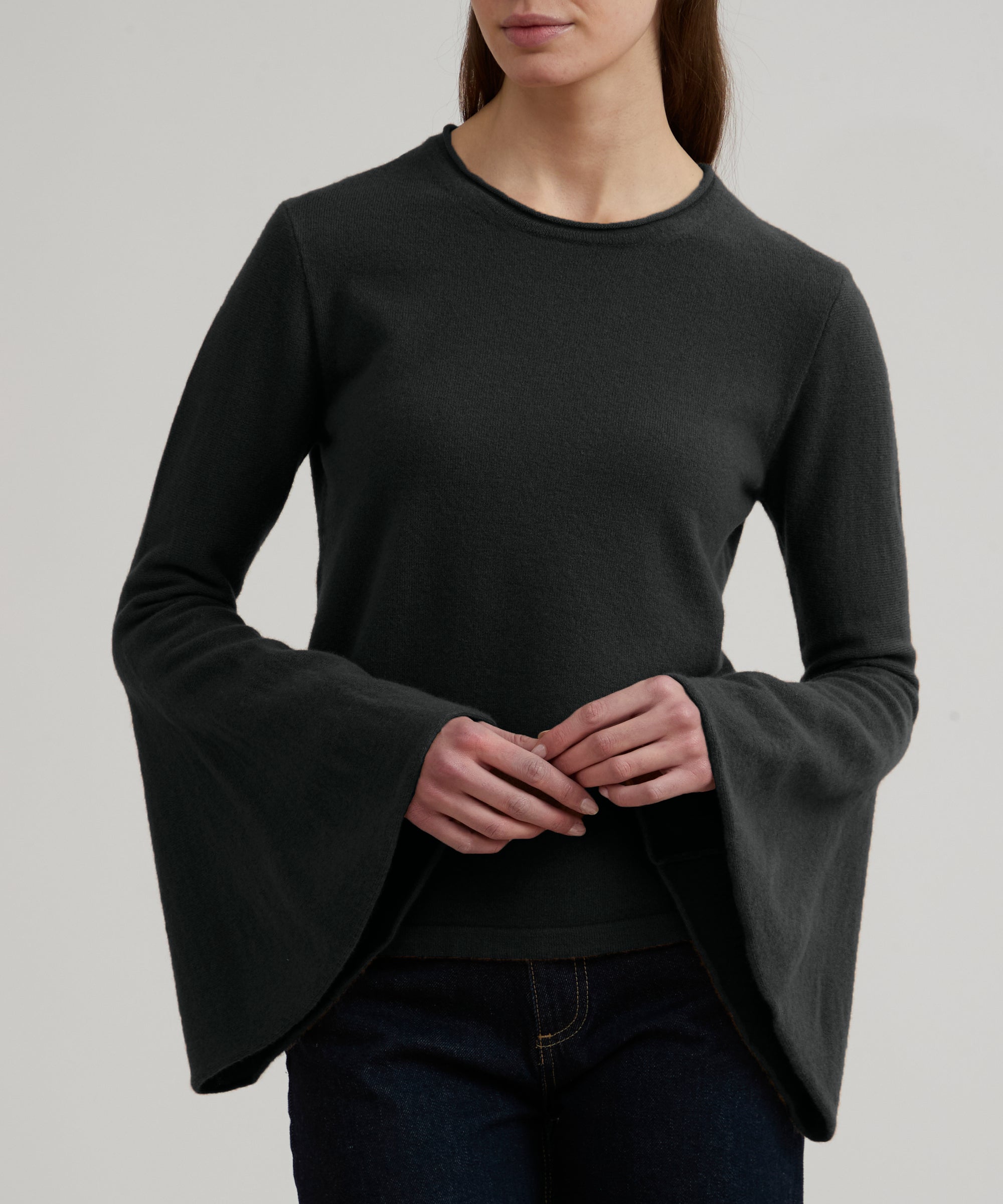 Maglia girocollo in lana merino extrafine cardata infeltrita, modello IRIS. Caratterizzata da una texture soffice e maniche ampie a campana, presenta uno scollo rotondo. Finezza 12.