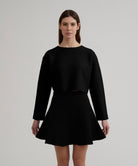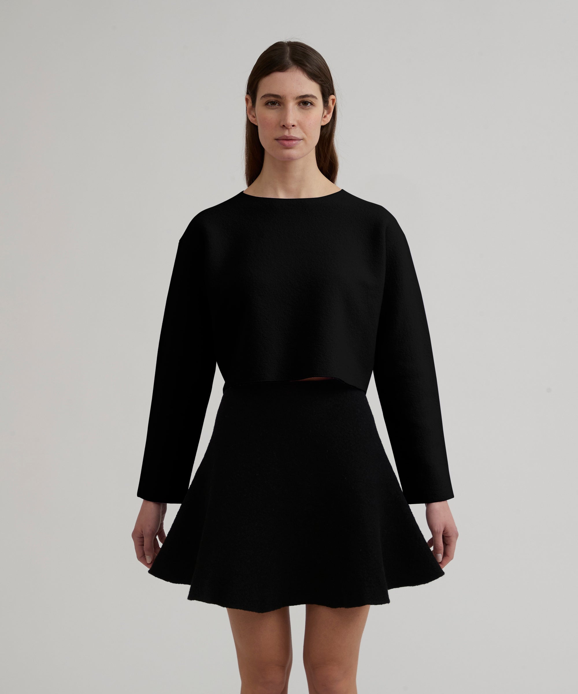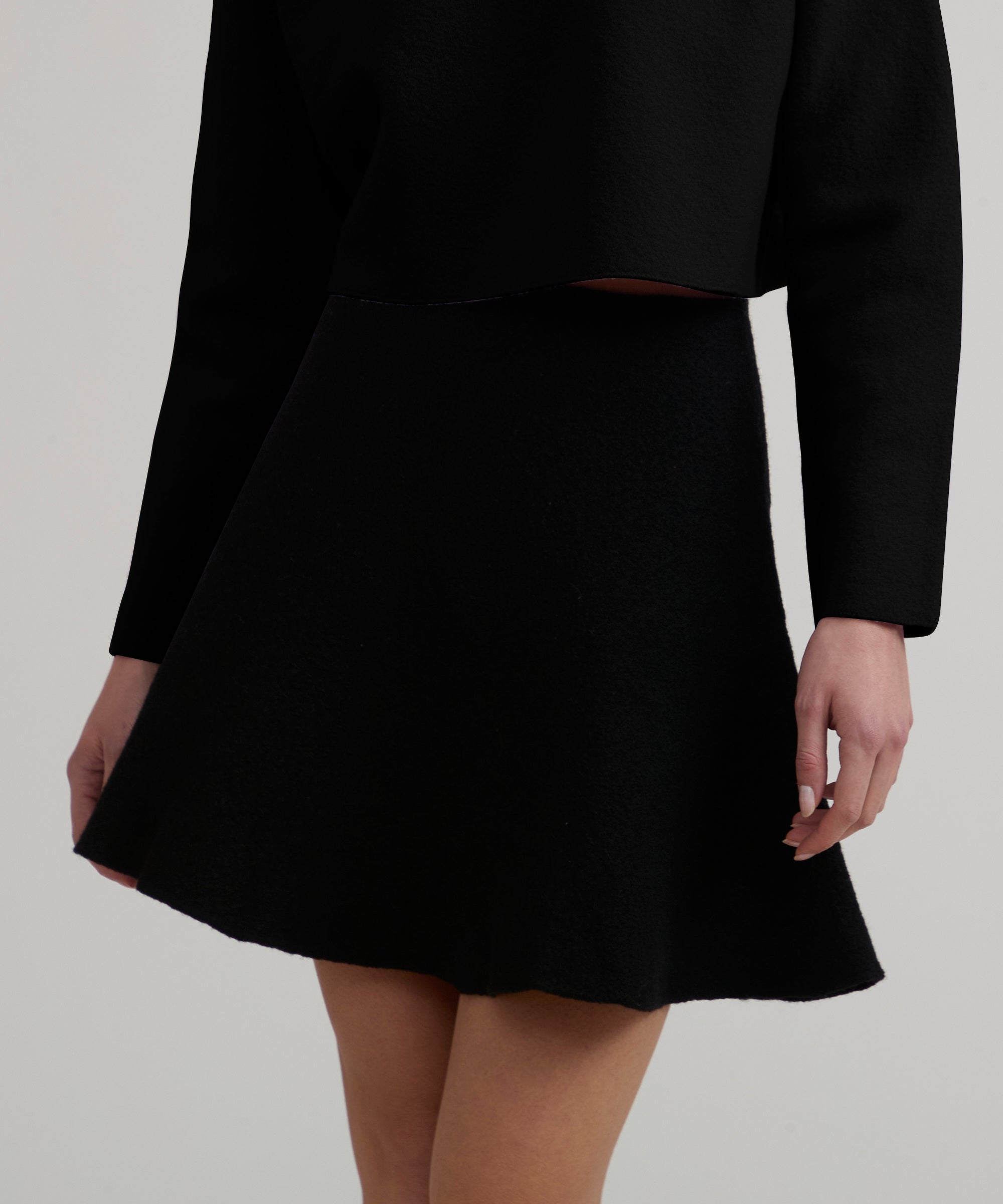 Gonna corta a ruota in lana super infeltrita, modello AGAPE. Realizzata in maglia compatta di lana con finissaggio super infeltrito. La linea ad A e la lavorazione a finezza 12 conferiscono struttura al capo, mantenendo una silhouette femminile e decisa. Fit regular.